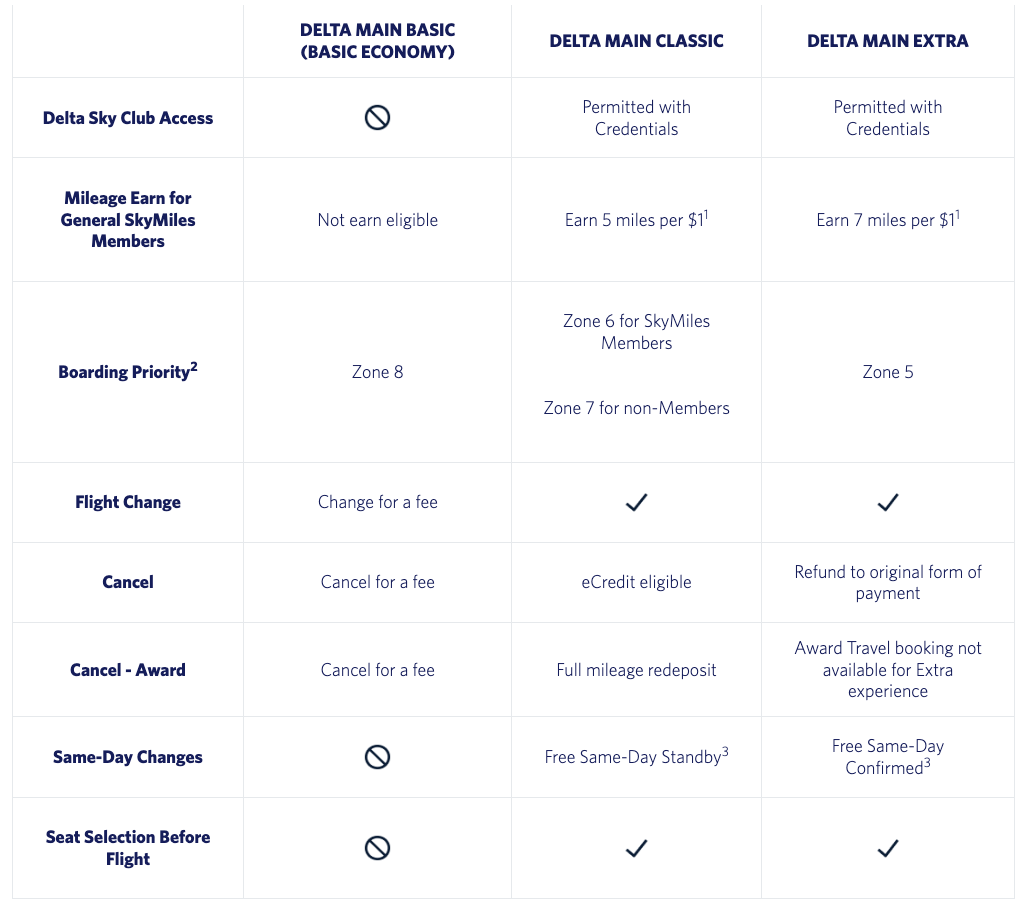 델타 항공은 동일한 이코노미 클래스 내에서도 운임을 세분화해 판매하고 있습니다. 2025년 5월부터는 같은 캐빈 안에서도 베이직(Basic), 클래식(Classic), 엑스트라(Extra) 세 가지 운임으로 구분되고 있는데요, 모두 동일한 좌석(이코노미)을 이용한다는 점에서는 같지만, 항공권의 변경/취소 조건, 탑승 순서, 좌석 지정, 마일리지 적립 등에서 차이가 있습니다. 이 중 ‘델타 메인 베이직’은 가장 제약이 많은 운임입니다. 델타 스카이마일 적립이 되지 않으며, 어떤 경우에도 델타 스카이 클럽 이용이 불가능하고, 가장 마지막 보딩 그룹(그룹 8)이 배정됩니다. 또한 사전 좌석 지정이 불가능한 점도 단점입니다. 베이직 운임은 이코노미 클래스인 ‘델타 메인’과 ‘델타 컴포트’에만 적용되며, 클래식과 엑스트라 운임은 이코노미뿐 아니라 델타 퍼스트, 델타 프리미엄 셀렉트, 델타 원까지 확장 적용됩니다.