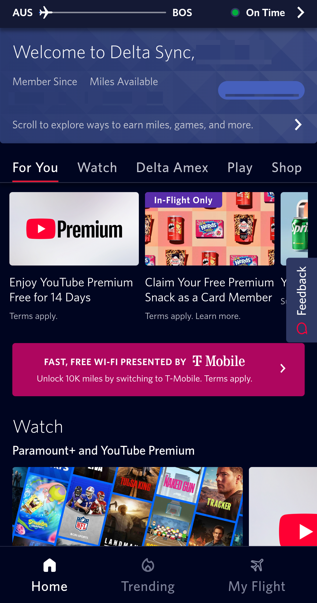 또한 델타 항공은 기내 와이파이를 통해 다양한 프로모션도 제공하고 있었습니다. 델타 항공 제휴 아메리칸 익스프레스 카드 보유 시 무료 스낵을 제공하는 혜택도 그중 하나였으며, 개인적으로는 우버 리저브 30% 할인 혜택이 인상적이었습니다. 이 외에도 기내 와이파이를 통해 파라마운트+ 프리미엄 콘텐츠에 접근할 수 있었는데, 특히 항공기에서 내린 이후에도 24시간 동안 해당 콘텐츠를 계속 이용할 수 있다는 점이 흥미로운 부분이었습니다.