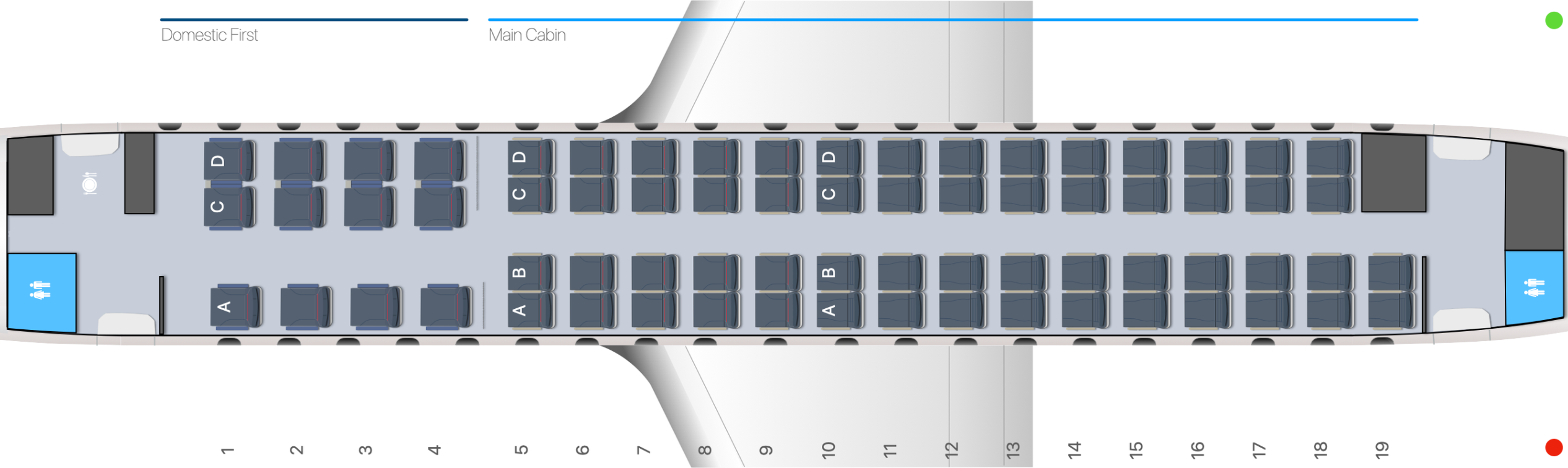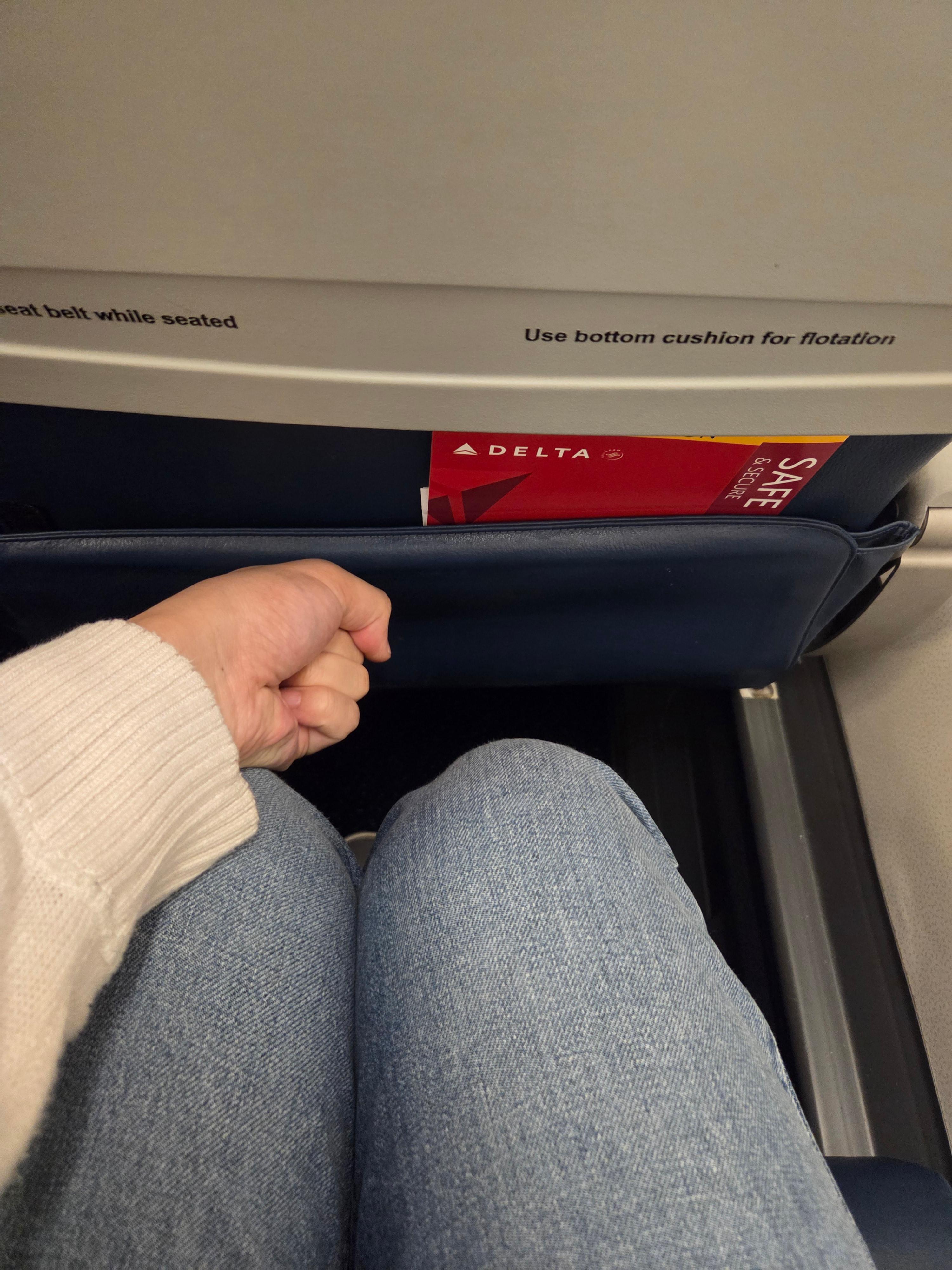 델타항공의 ERJ-175항공기는 발이나 짐을 넣을 수 있는 앞 좌석 밑 공간 사이가 분리가 되어 있지 않습니다. 따라서 옆자리에 동행이 있는 경우는 조금 더 편할 수도, 옆자리에 모르는 사람이 타는 경우는 옆사람의 공간을 침범하지 않기 위해 약간의 주의가 필요할 것 같았습니다. 화장실은 앞에 하나 뒤에 하나가 있어 70~76명의 승객이 이용하기에 충분했습니다. ERJ-175가 리저널 항공기임에도 실내 공간이 좁은 편은 아니기에 전체적으로 최대 3시간 미만으로 비행하는 항공기로는 불편함이 없을 정도의 기내 공간이었습니다.