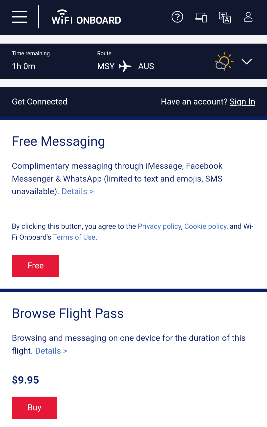 델타 항공의 ERJ-175항공기에는 따로 기내 엔터테인먼트 시스템이 탑재되어 있지는 않습니다. 개인 디바이스로 즐길 수 있는 엔터테인먼트 시스템도 설치되어 있지 않습니다. 대신 기내 와이파이는 설치되어 있어서 비행 중에도 인터넷을 즐길 수는 있는데요, 다만 제가 탑승했던 델타 항공의 ERJ-175 항공기의 와이파이는 무료가 아닌 유료로 제공되고 있었습니다. (델타 항공의 경우 일부 A350-900, B717, CRJ-700, CRJ-900, ERJ-170, ERJ-175 항공기를 제외한 다른 항공기에서는 와이파이를 무료로 제공하고 있습니다.) 대신, 유료 와이파이임에도 메시지 서비스는 무료로 이용이 가능하고요, 유료 와이파이의 가격은 $9.95입니다. 델타항공의 와이파이 정보는 이 링크에서 확인하실 수 있습니다.