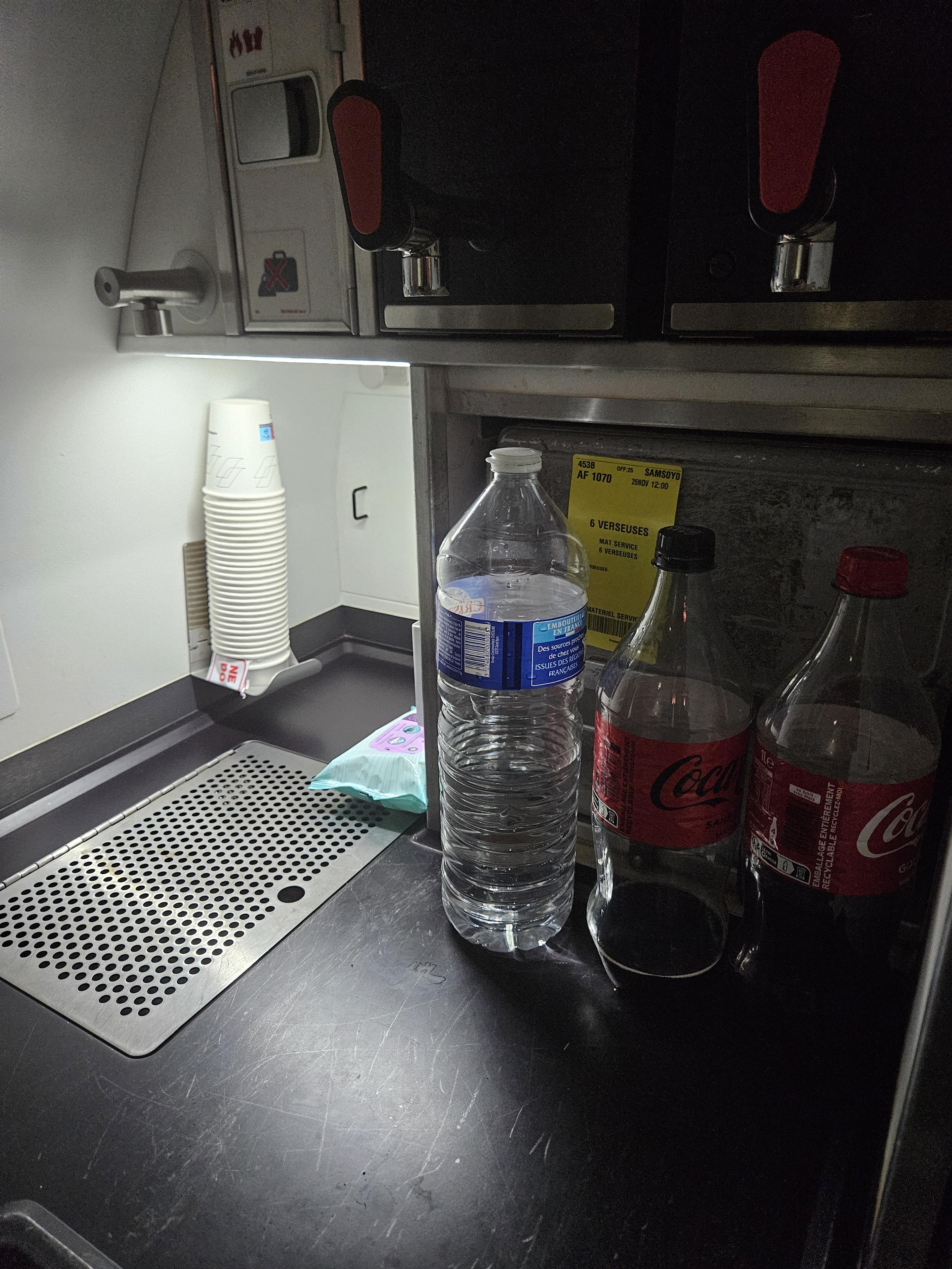 이번 비행은 약 3시간 정도가 걸리는, 단거리 중에서는 약간 긴 비행이었습니다. 비행중에 간단한 식사 서비스가 한번 제공되고 그 후에는 기내 뒷쪽의 셀프바에서 물과 콜라를 마실 수 있습니다. 그리고 중간중간 승무원이 물이 담긴 컵을 들고 돌아다니기도 했구요. 간단한 식사로는 샌드위치와 마들렌, 그리고 음료가 제공됩니다. 저는 샌드위치로는 잠봉뵈르를 선택했구요, 음료로는 레드와인을 선택했습니다. 참고로 음료는 여러개를 고를 수 있으니 여러개가 마시고 싶다고 너무 고민하지 마시구요 여러개 달라고 하시면 됩니다. 저도 와인과 티를 요청습니다. 잠봉뵈르도 괜찮았고, 마들렌도 괜찮았는데요, 이 레드 와인이 기내에서 무료로 제공되는 와인 치고는 너무 괜찮았습니다. 미국에 돌아와서 구입해보려고 했는데 미국에서는 팔지 않는 것 같더라구요. 이 부분에서 에어프랑스가 프랑스 항공사라는 걸 느꼈습니다. 사실 블루베리주스만 주구장창 주는 핀에어와 가장 다른부분이기도 하구요.