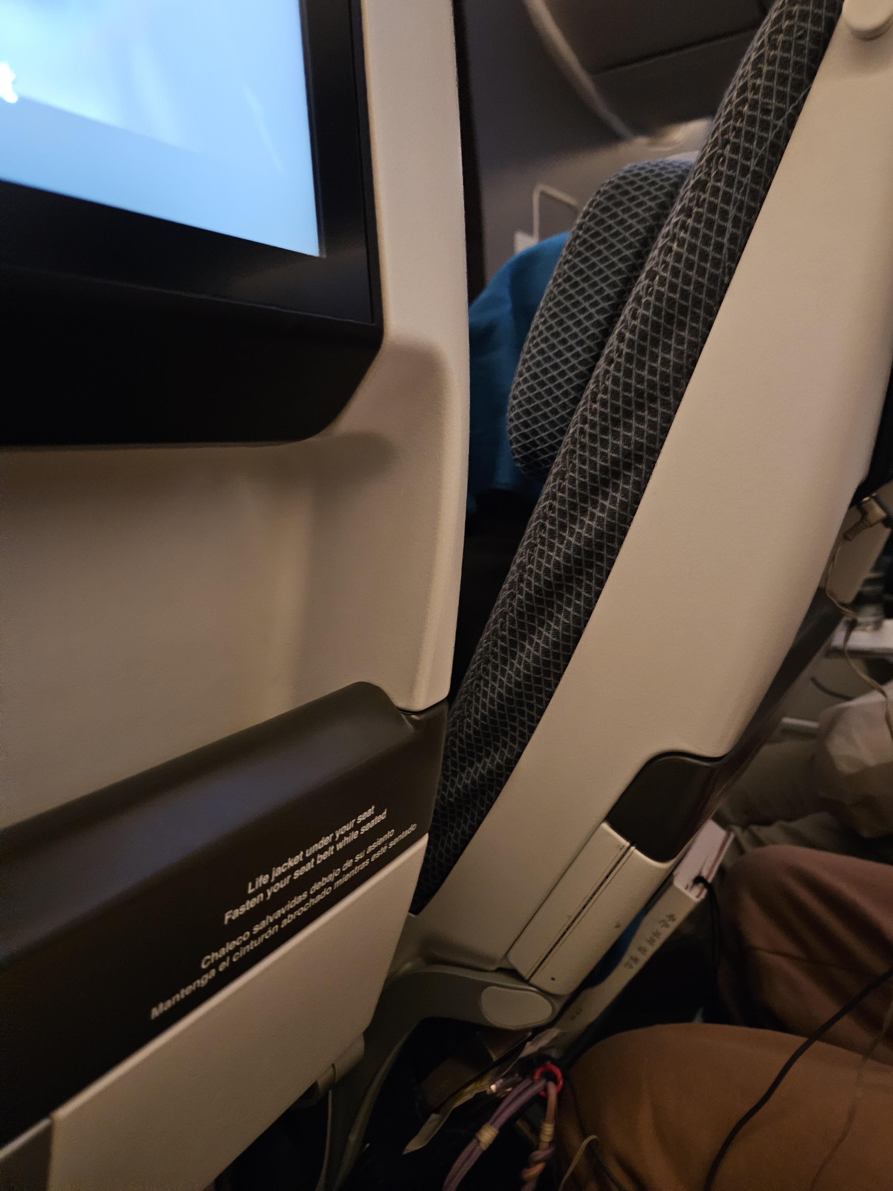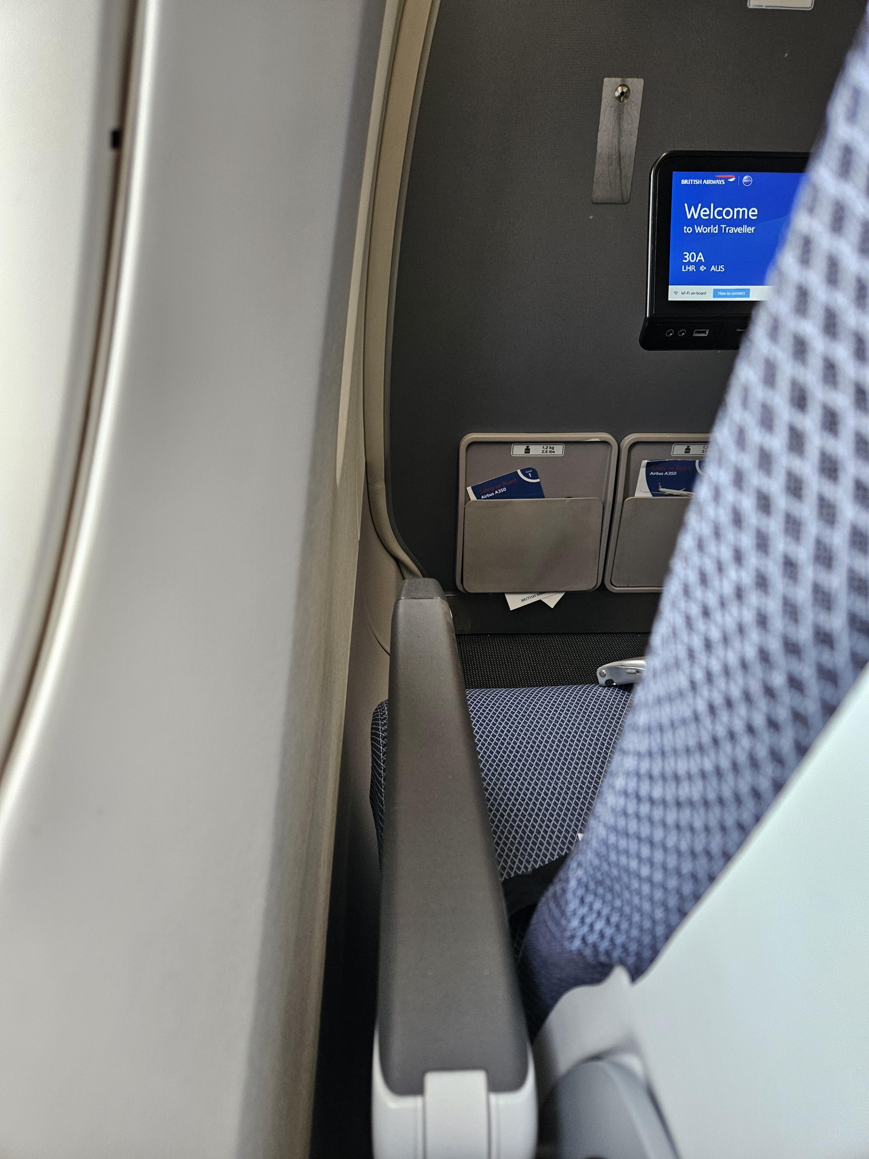 이번에 탑승한 좌석은 31A로 프리미엄 이코노미 클래스 캐빈 바로 뒷부분에 위치해 있는 좌석입니다. 참고로 이코노미 클래스 캐빈의 시작인 30열은 통로 확보 이슈로 2-3-2 배열이고 제가 탑승한 31열부터는 3-3-3 배열이었습니다. 원래는 이 30A를 선택하고 싶었는데 이미 누가 선택한 상황이었기에 그 뒷자리를 골랐습니다. 제가 탑승한 영국항공의 A350-1000은 영국항공이 가장 최근에 도입하기 시작한 기체로, 이 기체부터 비즈니스 클래스의 경우는 도어가 달린 스위트형 좌석이 설치되기 시작했습니다. 하지만 이코노미 클래스 좌석은 특별할 것 없었습니다. 31인치의 레그룸은 넓지도 좁지도 않은 평균적인 수준이었고요, 각 자리에는 개인용 모니터가 달려있었습니다. 장거리용 기체인 만큼 이코노미석에도 조절가능한 헤드레스트가 있었고요.
