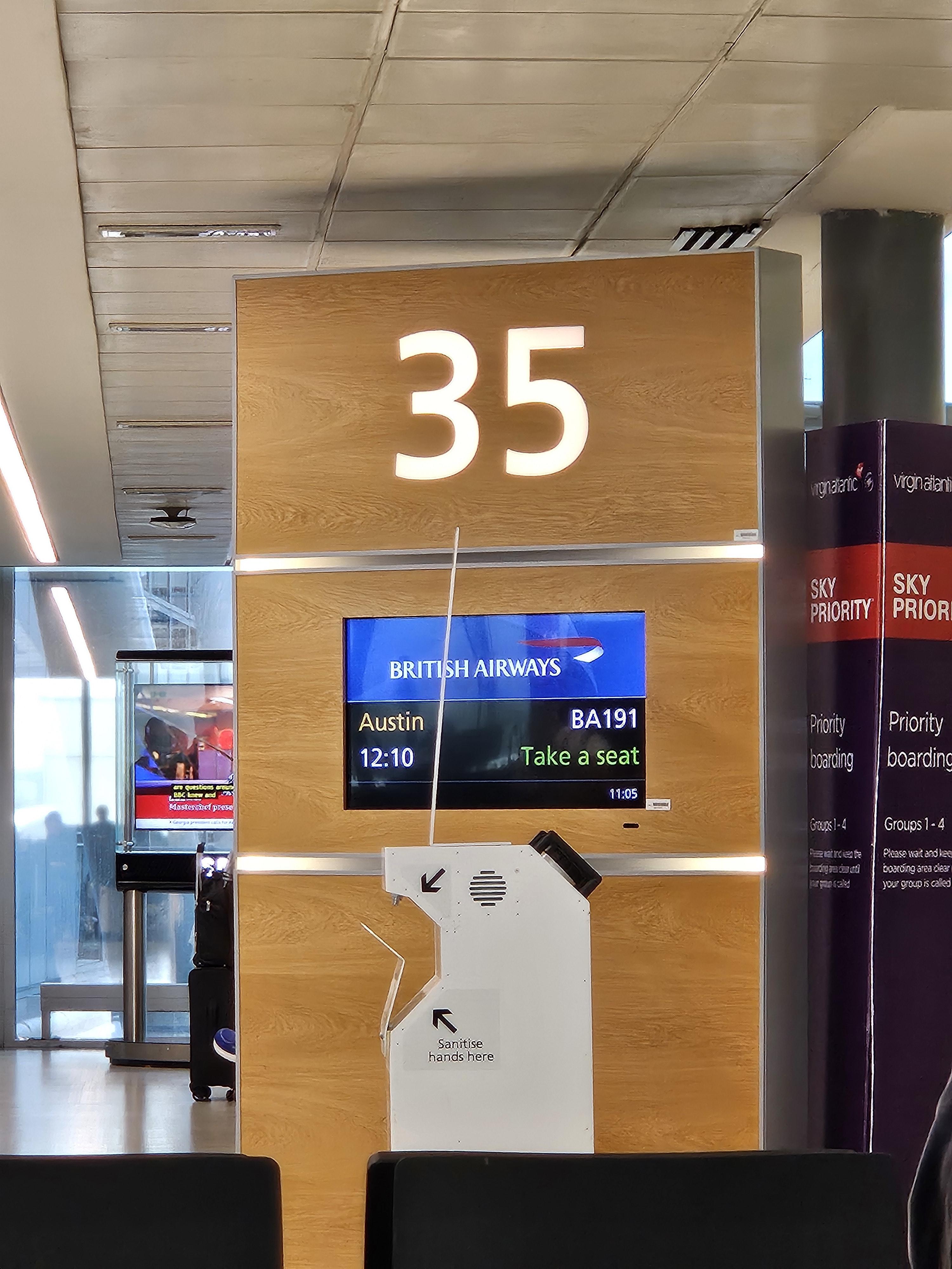 오스틴으로 가는 BA191편은 35번 게이트에서 출발했습니다. 35번 게이트는 터미널의 가장 끝에 위치하고 있는데 중앙의 라운지들이 모여있는 공간에서 걸어서 15분, 걸음이 느린 경우는 20분까지 걸릴 수 있기에 보딩 시간에 맞춰 여유롭게 이동하시는 게 좋을 것 같습니다. 보딩은 유로 에어포트에서와 마찬가지로 프리보딩, 그룹 1, 그룹 2, 그룹 3, 그룹 4.. 의 순서로 이루어졌습니다. 보딩에서 불편한 점은 몇 가지 있었습니다. 일단 현재 보딩 그룹이 그 어디에도 표시되어있지 않았고, 방송 또한 소리가 작아서 잘 들리지 않아 지금 보딩이 어떻게 이루어지고 있는지 알기 힘들다는 점이 있었습니다. 두 번째는, 지금 보딩 상황을 알기 어렵다 보니 모든 탑승객이 전부 탑승구 근처에 모여있어 탑승구가 붐비다 보니 정작 보딩 중인 그룹에 해당하는 승객들이 그 줄을 뚫고 게이트로 향하기 어려웠습니다. 라인이 쳐져있는 줄의 시작점에서는 직원이 보딩패스를 확인 후 해당되는 그룹만 통과시키긴 했지만, 전반적인 보딩 과정이 썩 만족스럽지는 않았습니다.