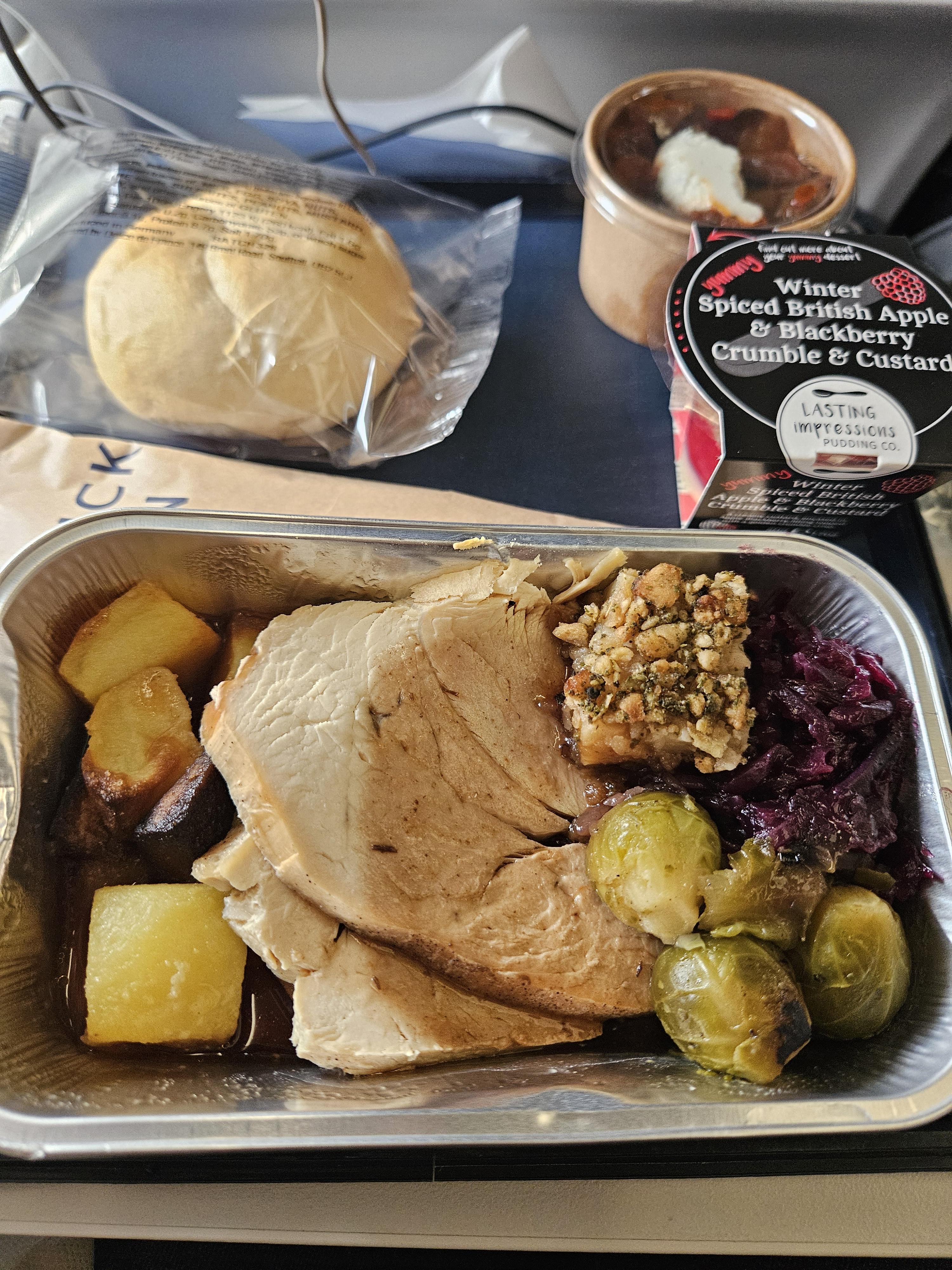 첫 식전음료 서비스에는 음료와 더불어 프레젤을 받았습니다. 첫 번째 기내식으로는 크리스마스 칠면조 요리, 식전빵, 커스터드, 샐러드가 나왔습니다. 칠면조 요리는 크리스마스 시즌에만 실리는 시즌 기내식인데 물론 칠면조라 살이 퍽퍽하긴 했지만 (영국항공 기내식이 맛이 그렇게 좋지 않은 걸로 알고 있는데 제가 기대가 너무 없어서 그랬는지) 전반적으로 맛이 나쁘지 않았습니다. 다만 같이 동행했던 일행은 그다지 맛이 없었다는 평을 남겼습니다. 식후에는 음료 서비스가 한번 더 진행되었고 저는 레드 와인과 블랙티에 우유와 설탕을 넣어 마셨습니다. 두 번째 기내식으로는 종이 박스에 담긴 토마토 치킨 패스트리를 받았습니다. 이건 맛이 꽤 괜찮았고 제 일행도 같은 의견이었습니다. 10시간 비행에서 2번의 기내식이 아닌 기내식 1번과 간식 1번이 아쉽긴 하지만, 첫 기내식의 양이 부족하지 않아서 비행 중 배가 고프다는 느낌은 들지 않았습니다. 와인은 무난했지만, 지난 에어프랑스에서의 와인보다는 아쉬웠습니다.