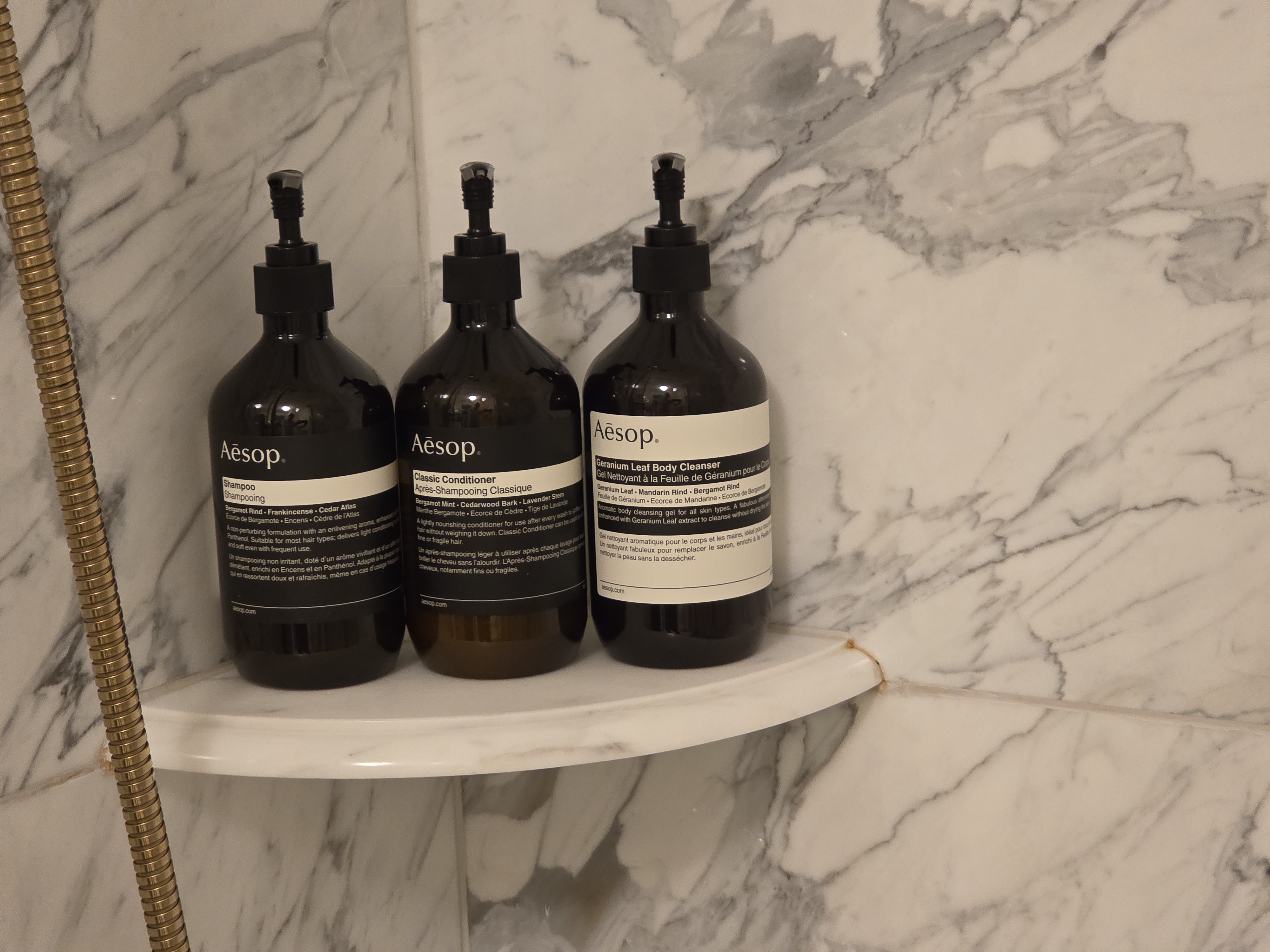 화장실은 어두운 대리석과 무늬가 선명한 대리석, 흰색과 골드톤을 사용해 상대적으로 톤 다운된 느낌을 주는 침실에 비해 화려한 인테리어를 자랑했습니다. 세면대는 2개가 있어서 2명이 동시에 양치를 하기에는 편했지만 변기가 세면대 바로 뒤 오픈된 공간에 위치하고 있어 2명이 동시에 화장실을 사용하기에는 조금 어려워 보였습니다. 샤워 부스는 타일 대신 대리석으로 마감되어 고급스러웠고 수압과 온수 모두 너무 잘 나와서 즐거운 샤워를 즐길 수 있었습니다.