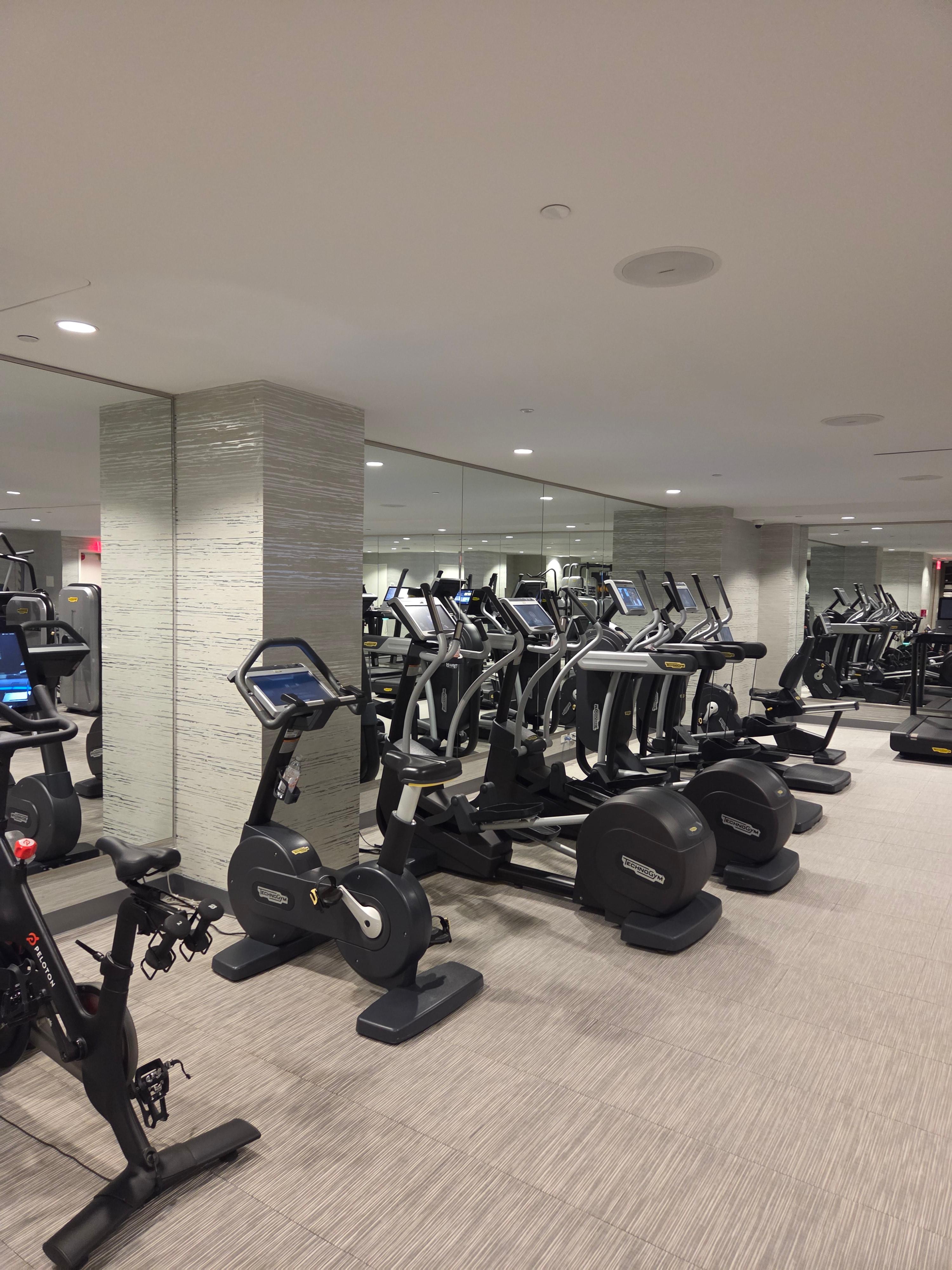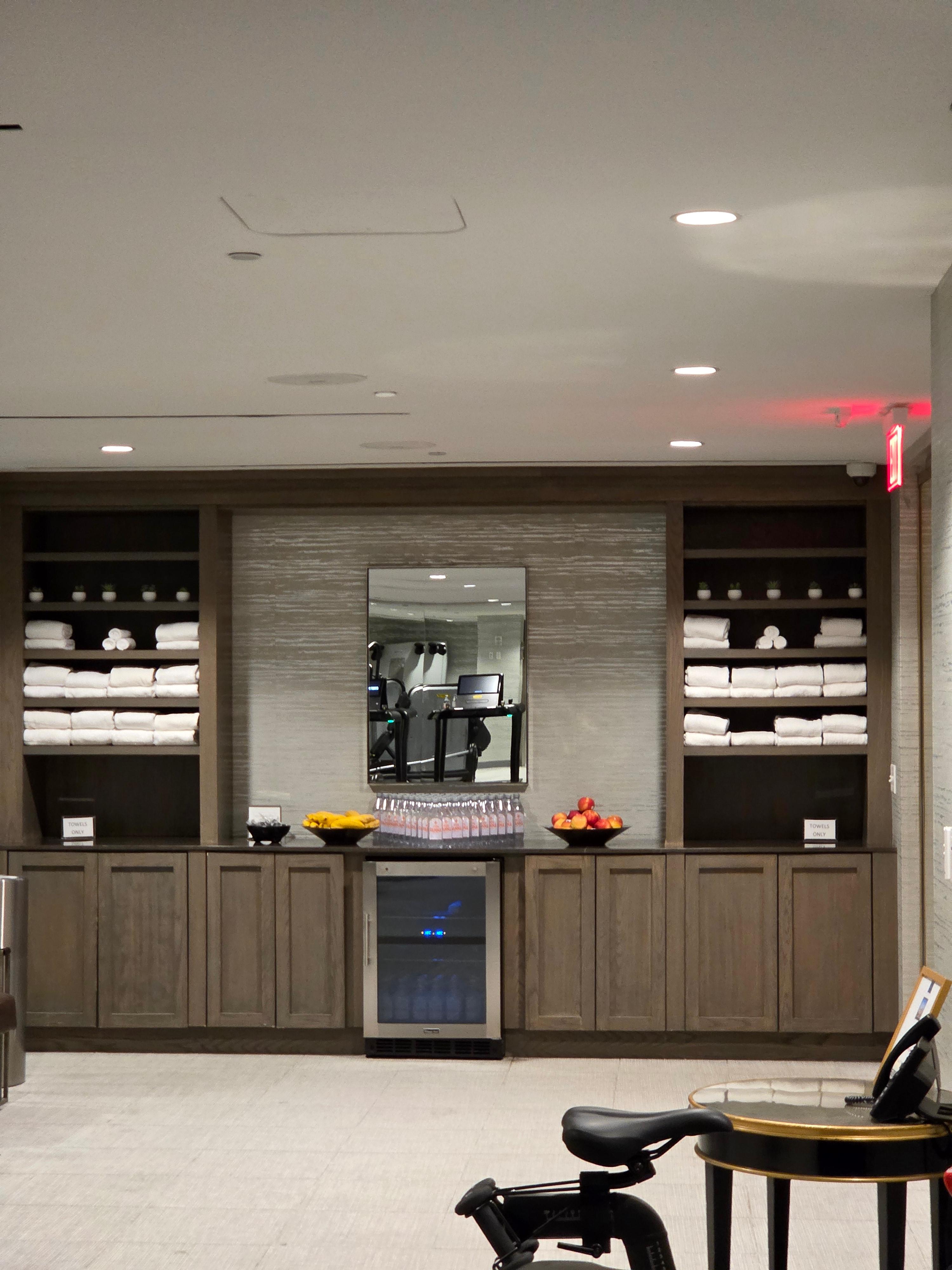 호텔 내의 시설로는 가장 먼저 피트니스 센터가 있었습니다. 운동 기구들로는 테크노짐 제품이 있었으며 기구들 뿐만 아니라 프리 웨이트를 할 수 있는 기구들도 충분히 마련되어 있었고 공간도 넉넉해 만족스러운 피트니스 센터였습니다. 피트니스 센터에는 화장실과 더불어 넉넉한 양의 물과 바나나, 사과가 있어서 물이 부족하실 때 들려서 물을 가져가기도 괜찮아 보였습니다.
