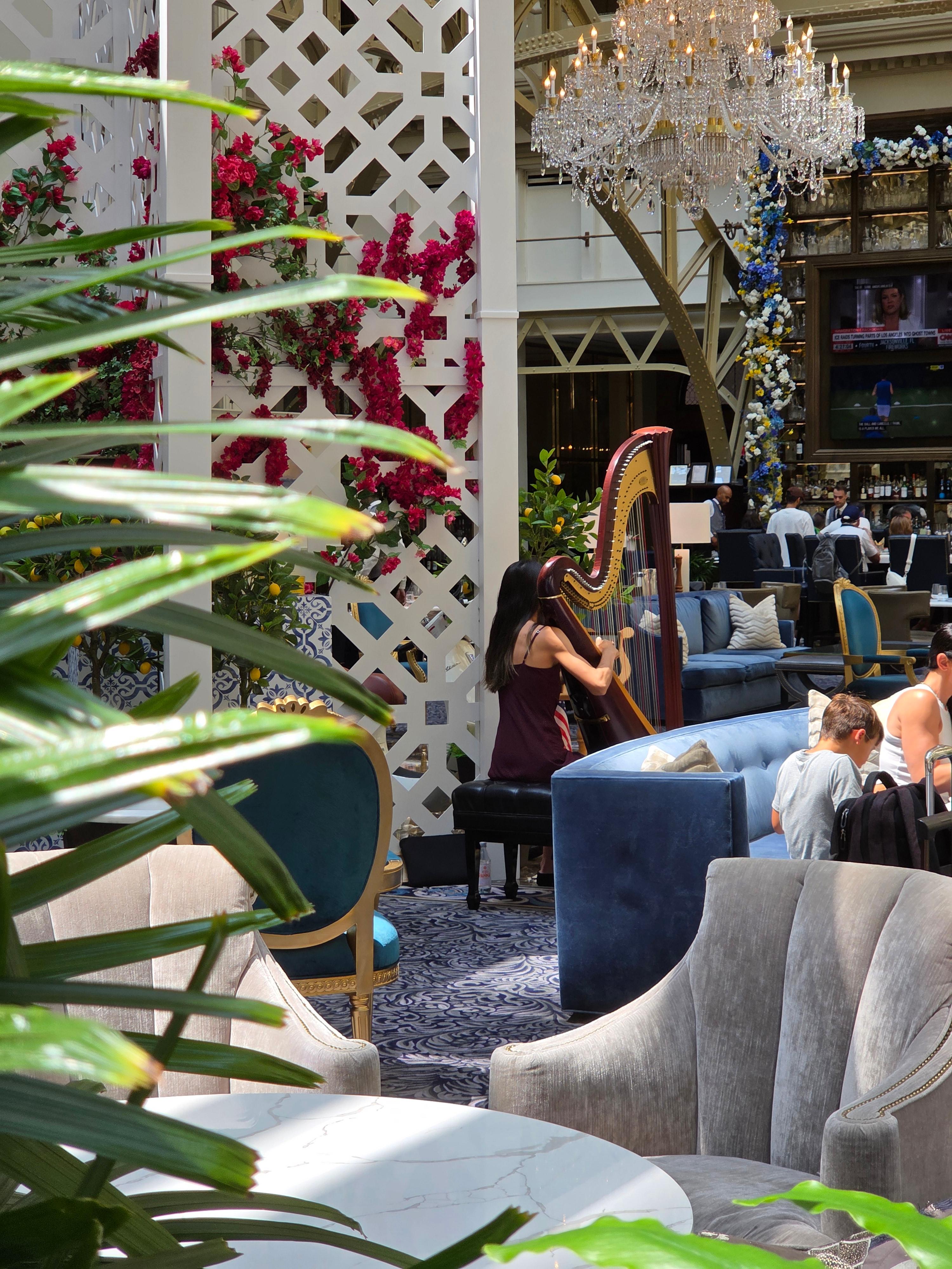 체크인 데스크가 있는 에이트리움이 아무래도 이 호텔의 가장 차별화된 포인트인 것 같은데요, 유리로 마감된 천장에서 자연스럽게 떨어지는 자연광과 에이트리움 곳곳을 장식하고 있는 다양한 꽃들과 식물들 덕분에 실내에 있으면서도 마치 실외에 있는듯한 느낌이 드는 에이트리움은 어두운 대리석과 카펫과 더불어 마찬가지로 어두운 톤의 벨벳재질로 마감된 소파와 의자들이 잘 어울려 자연스러우면서도 고풍스러운 워싱턴 DC를 잘 보여주는 인상적인 분위기였습니다. 제가 체크인을 하던 시간은 오후 2시 30분 정도였는데요, 마침 에이트리움에서 하프 연주자가 하프를 연주하고 있어 그 멜로디가 에이트리움의 분위기와 너무나 잘 어울렸습니다.