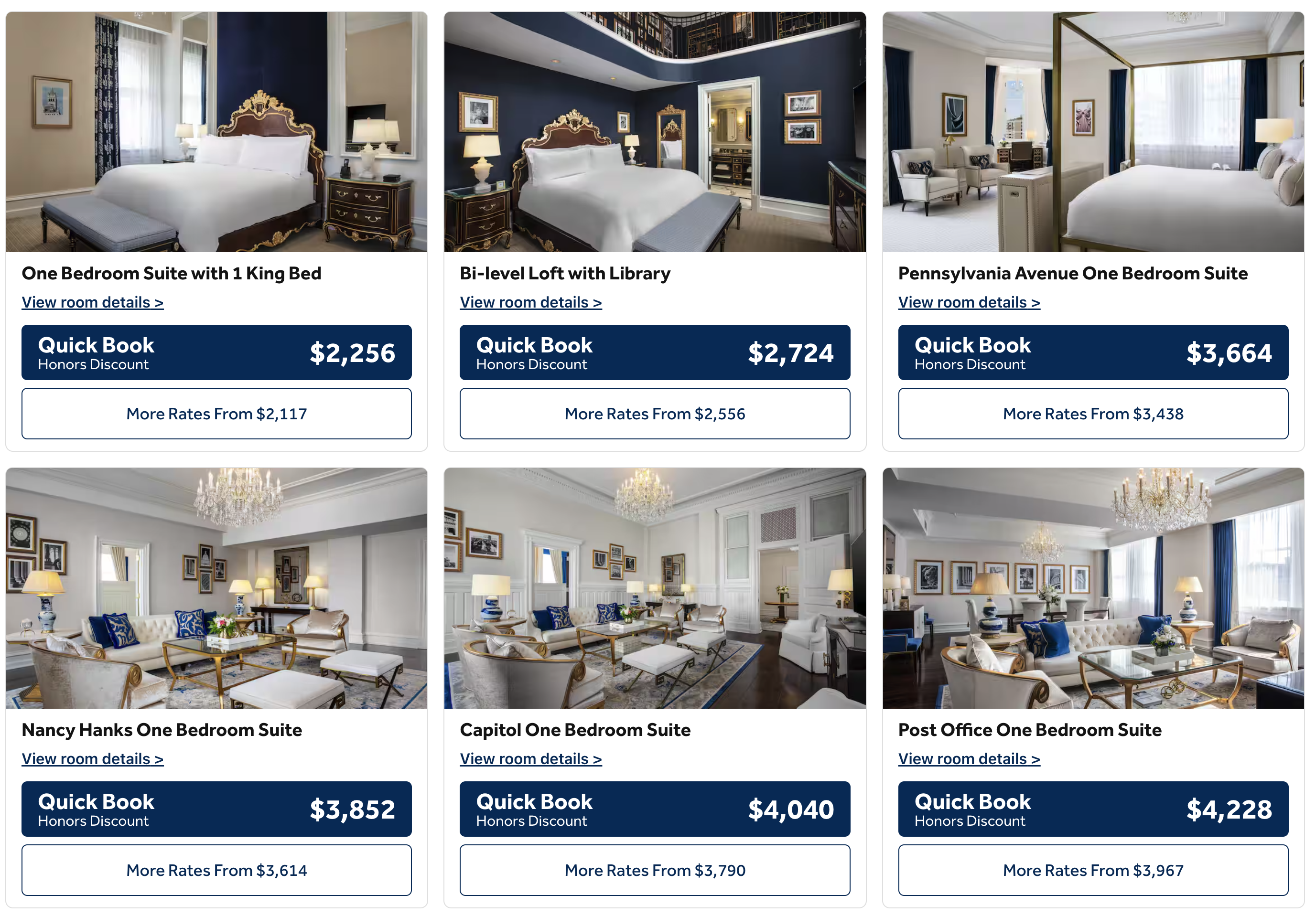 월도프 아스토리아 워싱턴 DC에는 두 타입의 게스트룸과 다양한 타입의 스위트 룸을 가지고 있습니다. 게스트 룸의 경우 디럭스, 프리미엄으로 나뉘며 디럭스의 경우 약 32m2, 프리미엄의 경우 37m2의 공간을 가지고 있습니다. 디럭스 룸과 프리미엄 룸 모두 킹 사이즈 침대가 1개 들어가 있고, 투숙 정원이 3명인 게스트 룸과 퀸 사이즈 침대 2개가 들어가 있고 투숙 정원이 4명인 게스트 룸을 가지고 있습니다. 디럭스룸의 경우 약 600달러(약 81.5만 원), 프리미엄룸의 경우 약 750달러(약 102만 원)부터 시작하며 2 퀸 베드 타입의 게스트룸이 조금 더 비싼 편입니다. 스위트 룸의 경우 종류가 너무 다양해 모든 스위트 룸 타입을 설명하는 건 의미가 없을 것 같고, 가장 저렴한 스위트 룸은 슈페리어 스튜디오 스위트로 가격은 약 1250달러(약 170만 원)부터 시작합니다. 포인트 투숙의 경우 가장 기본방인 디럭스 게스트 룸만 고정 가격으로 12만 힐튼 포인트가 필요하며, 프리미엄 게스트 룸은 약 35만 포인트 이상, 스위트의 경우 약 45만 포인트 이상이 필요합니다.