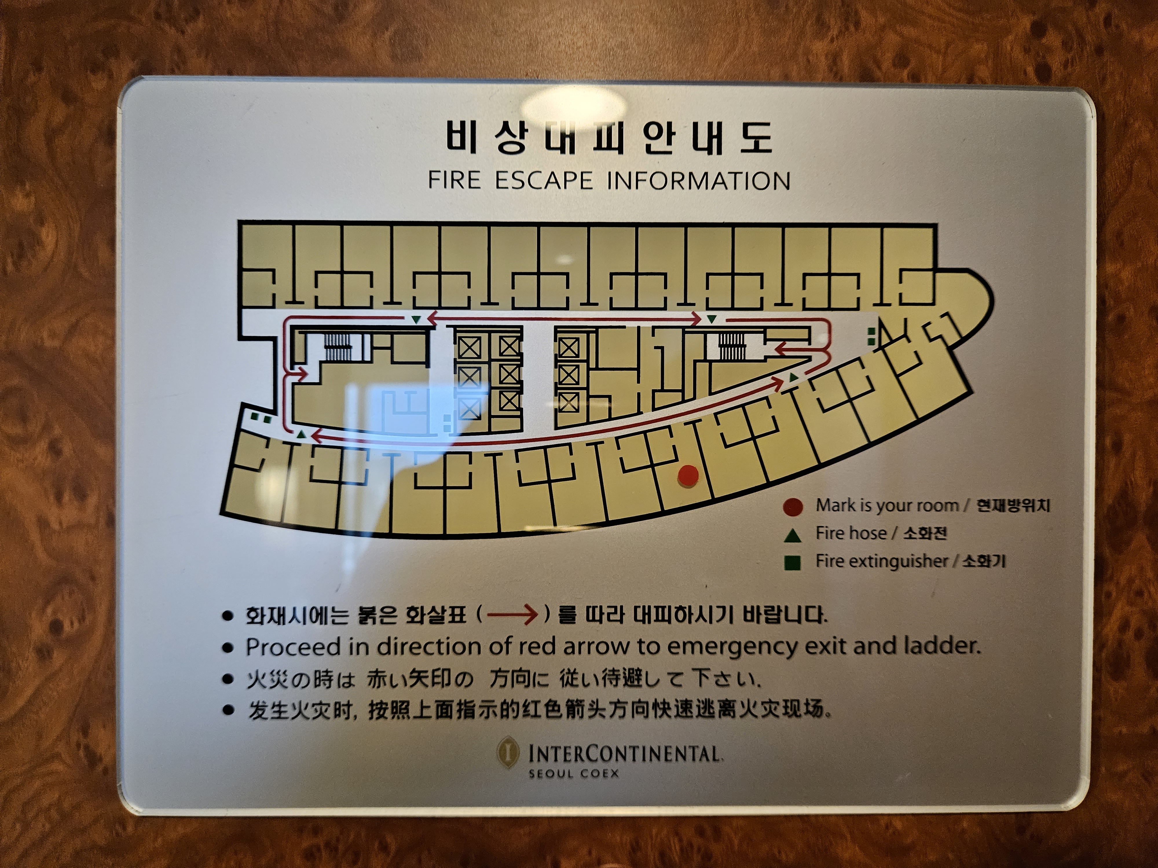 고층 봉은사뷰 객실의 넓이는 37제곱미터(약 11평)로 두 명이서 숙박하기에는 충분한 넓이로 28인치 캐리어를 2~3개 펴놓아도 이동할 공간이 충분한 넓이였습니다. 바로 옆의 인터컨티넨탈 그랜드 파르나스와 비교해 보면 그랜드 파르나스의 기본방 넓이는 40제곱미터로 그랜드 파르나스가 약 1평 정도 더 넓으나 큰 차이는 아닙니다. 비상 대피 안내도를 보면 가장 오른쪽 봉은사 방향 스위트룸을 제외하고는 모든 객실이 거의 같은 구조로 되어 있는 것을 확인할 수 있습니다.