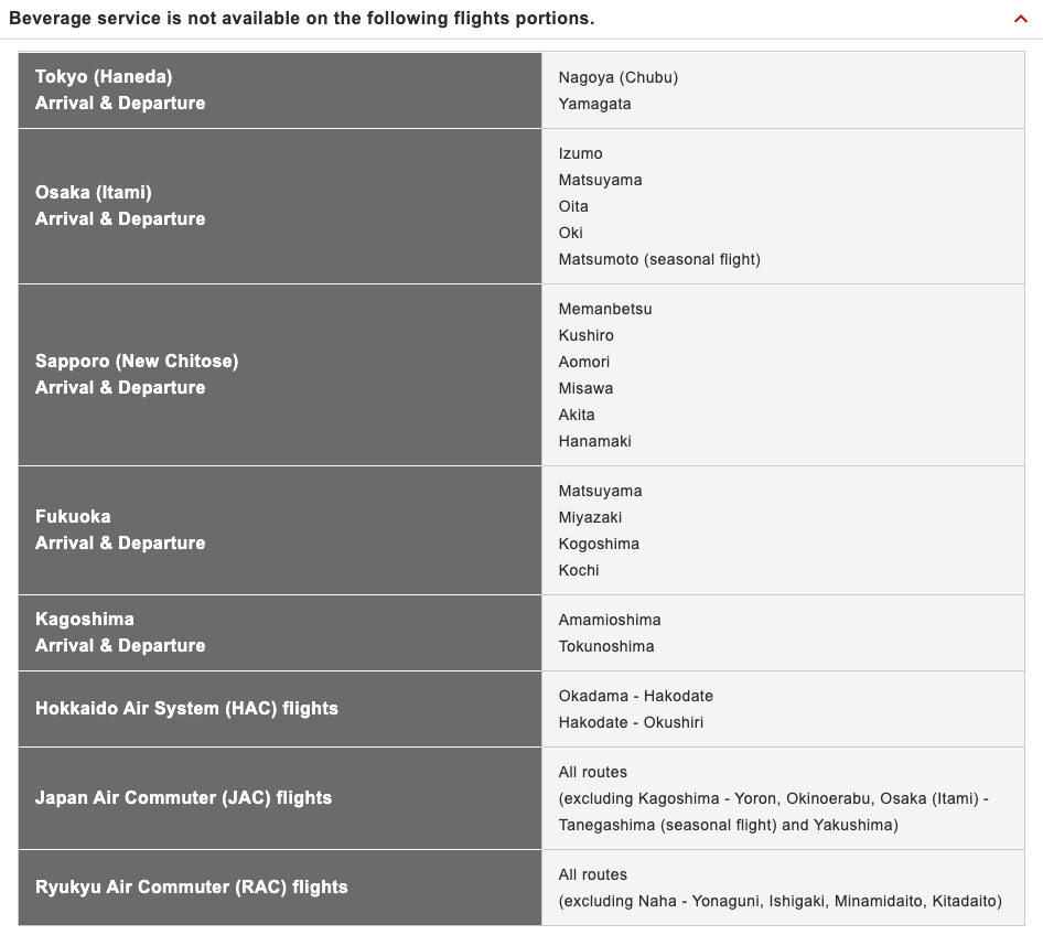 일본항공의 국내선의 기내서비스는 간소하게 음료와 스낵 서비스 한 번만 제공됩니다. 하네다 ↔ 나고야 노선과 같이 일부 비행시간이 아주 짧은 노선의 경우 음료 서비스가 아예 없는 노선도 있습니다. 또한 음료 서비스를 할 수 없는 만큼 비행시간이 짧지는 않지만, 비행시간이 넉넉하지 않은 도쿄 하네다 ↔ 오사카 노선을 포함한 일부 노선의 경우 음료 서비스는 진행하지만 따뜻한 녹차는 제공되지 않습니다. 아마도 녹차를 우리는 충분한 시간이 없다고 판단하는 모양입니다.