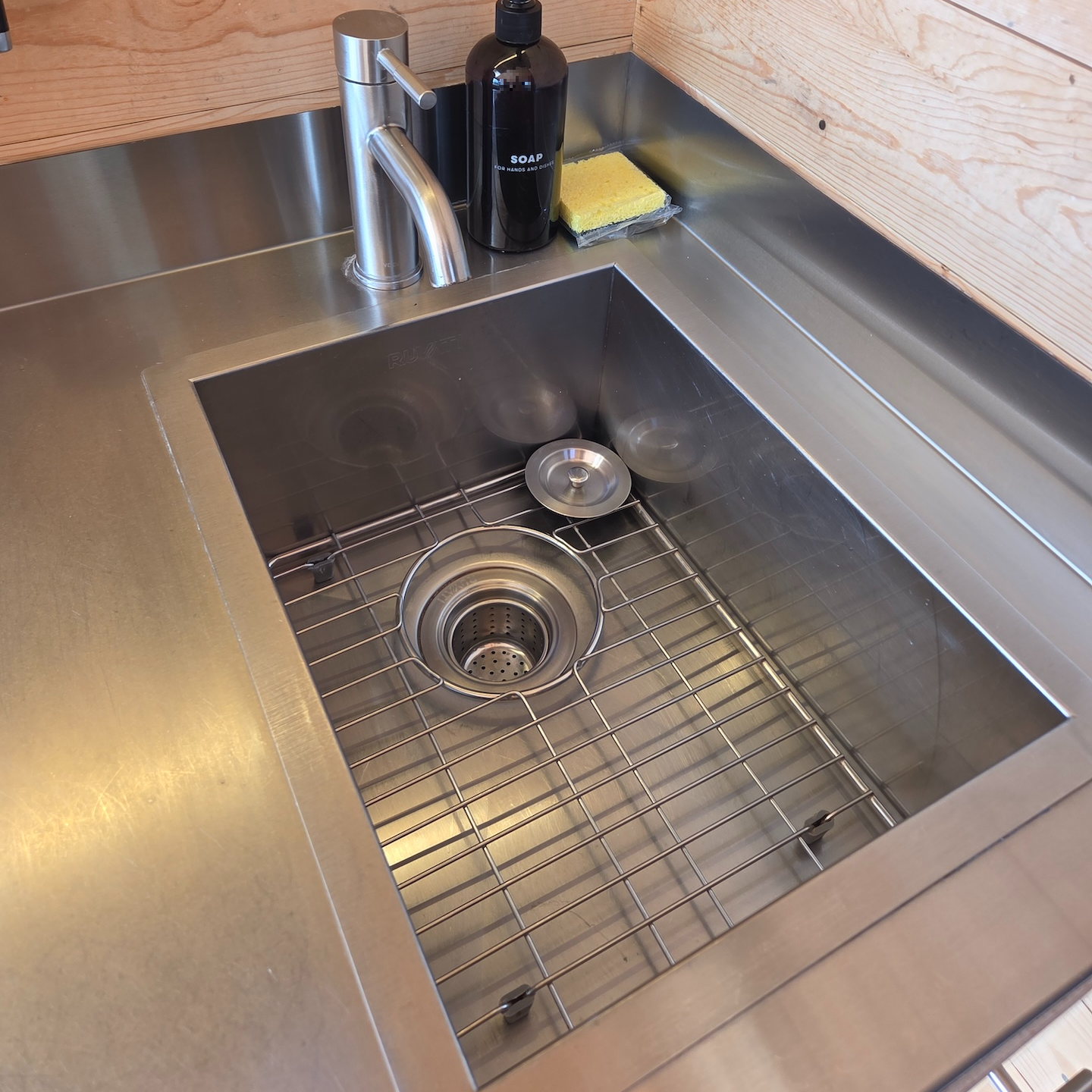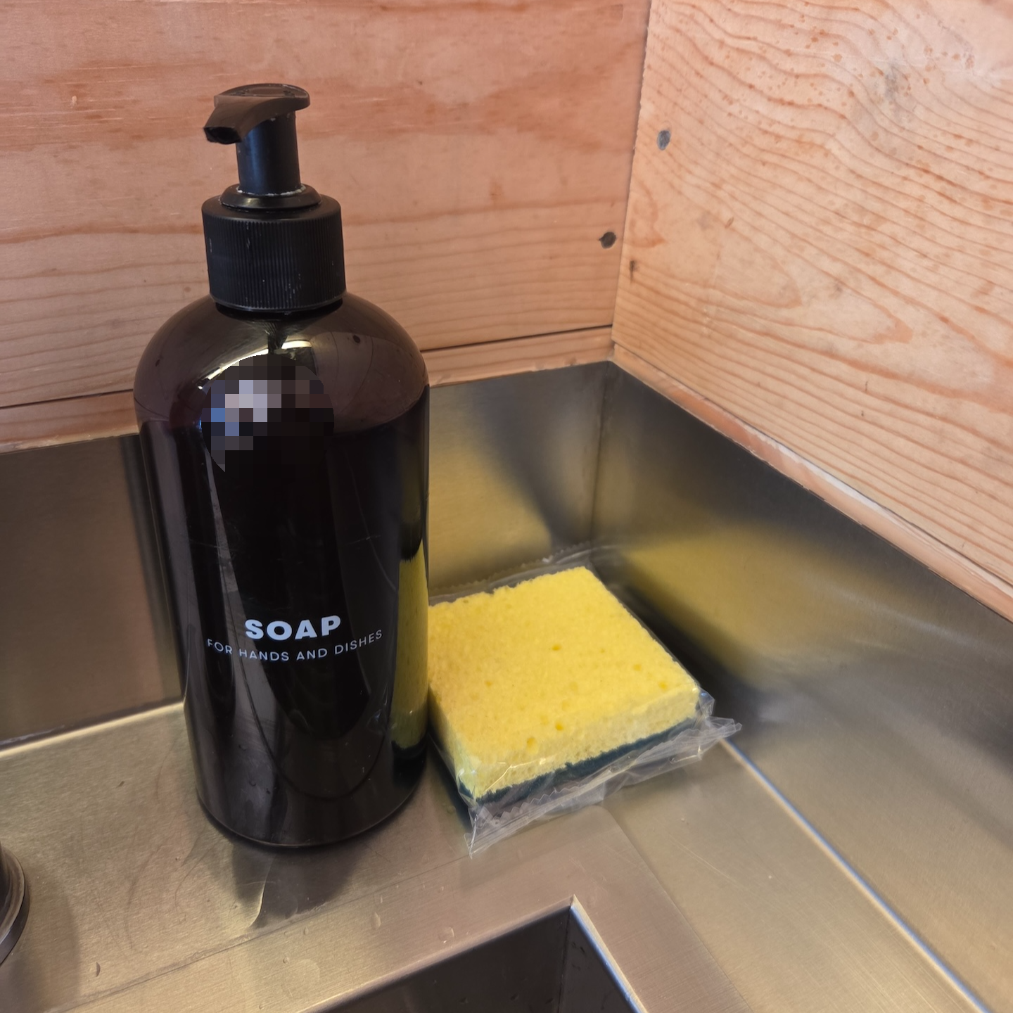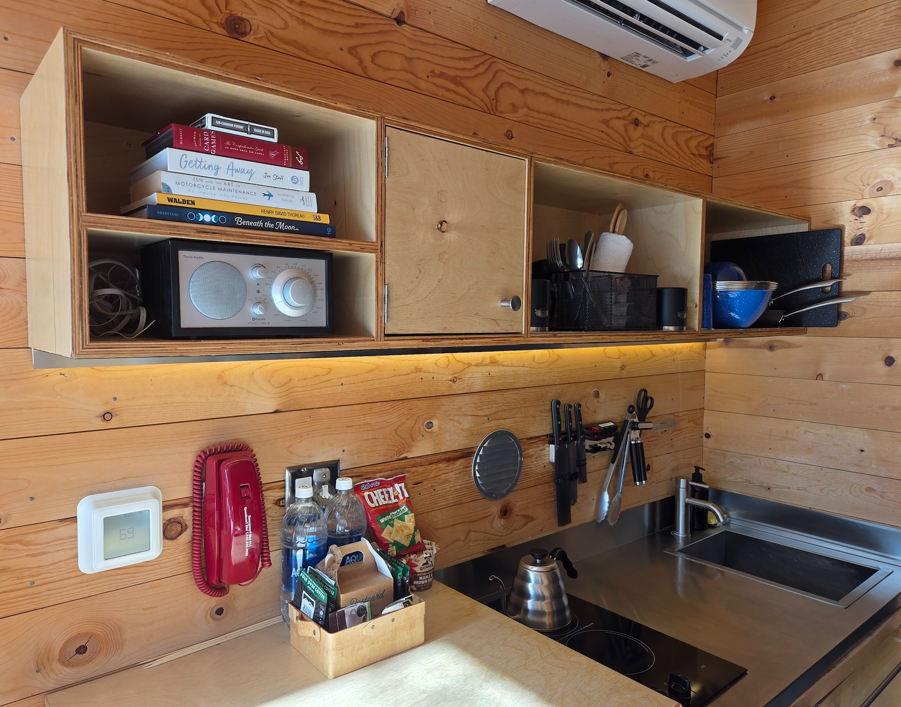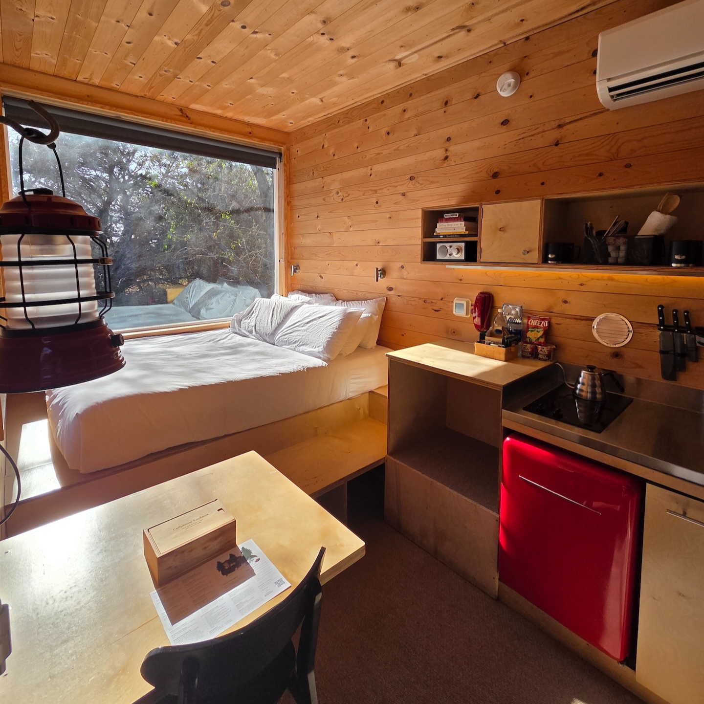 싱크대 위쪽에는 자석형 오거나이저가 설치되어 있어 각종 주방 도구를 걸어둘 수 있었고, 상부 선반에는 조리와 식사에 필요한 도구들이 정리되어 있었습니다. 그 옆의 수납공간 내부에는 거울이 부착되어 있어 유용하게 사용할 수 있었고, 블루투스 스피커와 간단한 책, 트럼프 카드도 함께 비치되어 있었습니다. 주방 뒤쪽에는 작은 테이블이 있었고, 그 위에는 안내문과 지도, 그리고 나무 박스가 놓여 있었습니다. 이 나무 박스는 디지털 디톡스를 위한 용도로 휴대폰을 보관할 수 있도록 마련된 것이었습니다. 의자는 하나만 제공되었는데, 반대편은 침대가 있는 단에 앉을 수 있도록 설계되어 있었습니다.