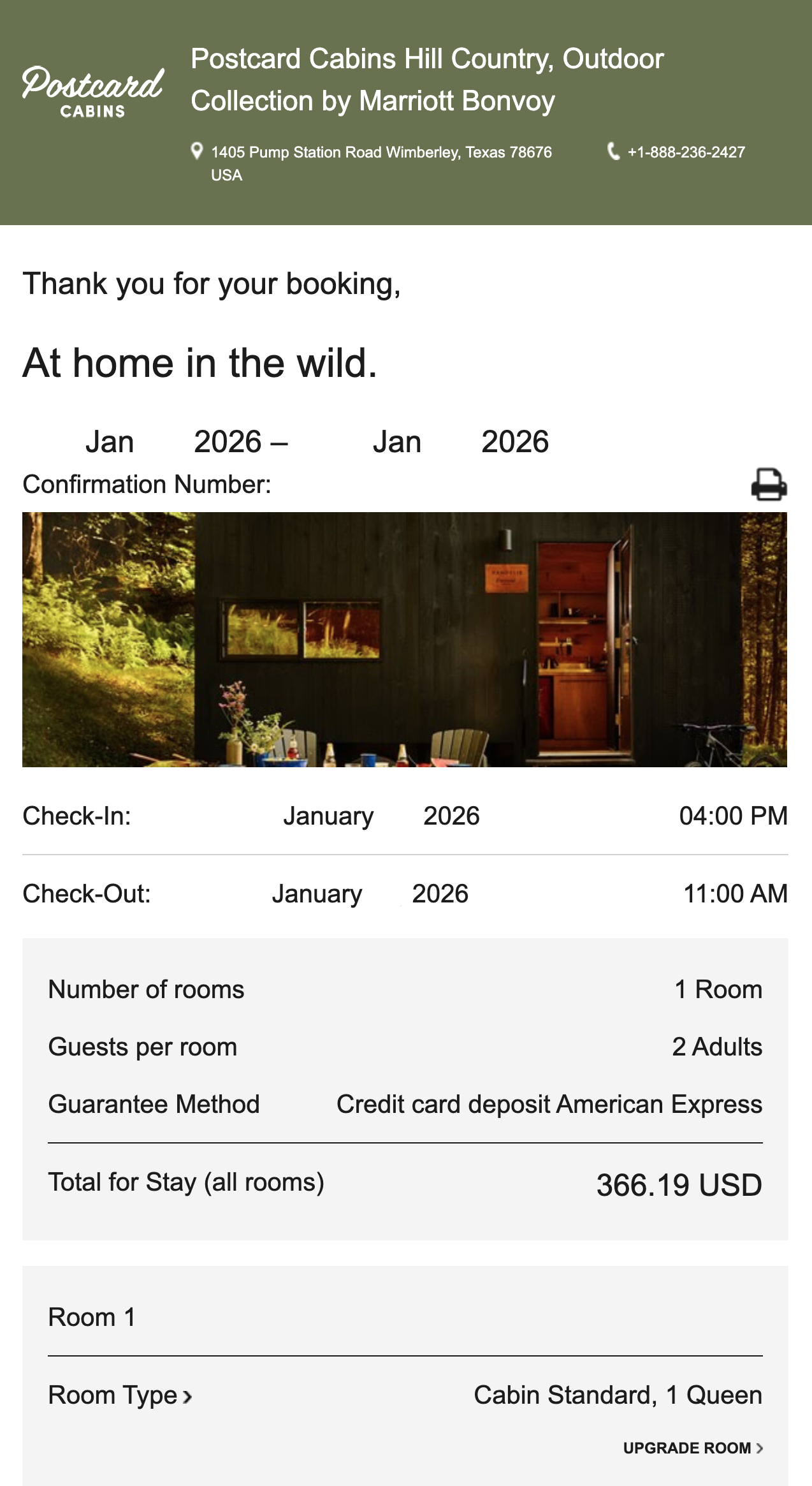 저는 주말을 포함한 2박 일정으로 포스트카드 캐빈 힐 컨트리의 1 퀸 스탠다드 타입 캐빈을 예약했습니다. 숙박 약 2주 전에 예약했고, 세금과 각종 Fee를 포함해 총 366달러, 1박당 약 183달러를 지불했습니다.