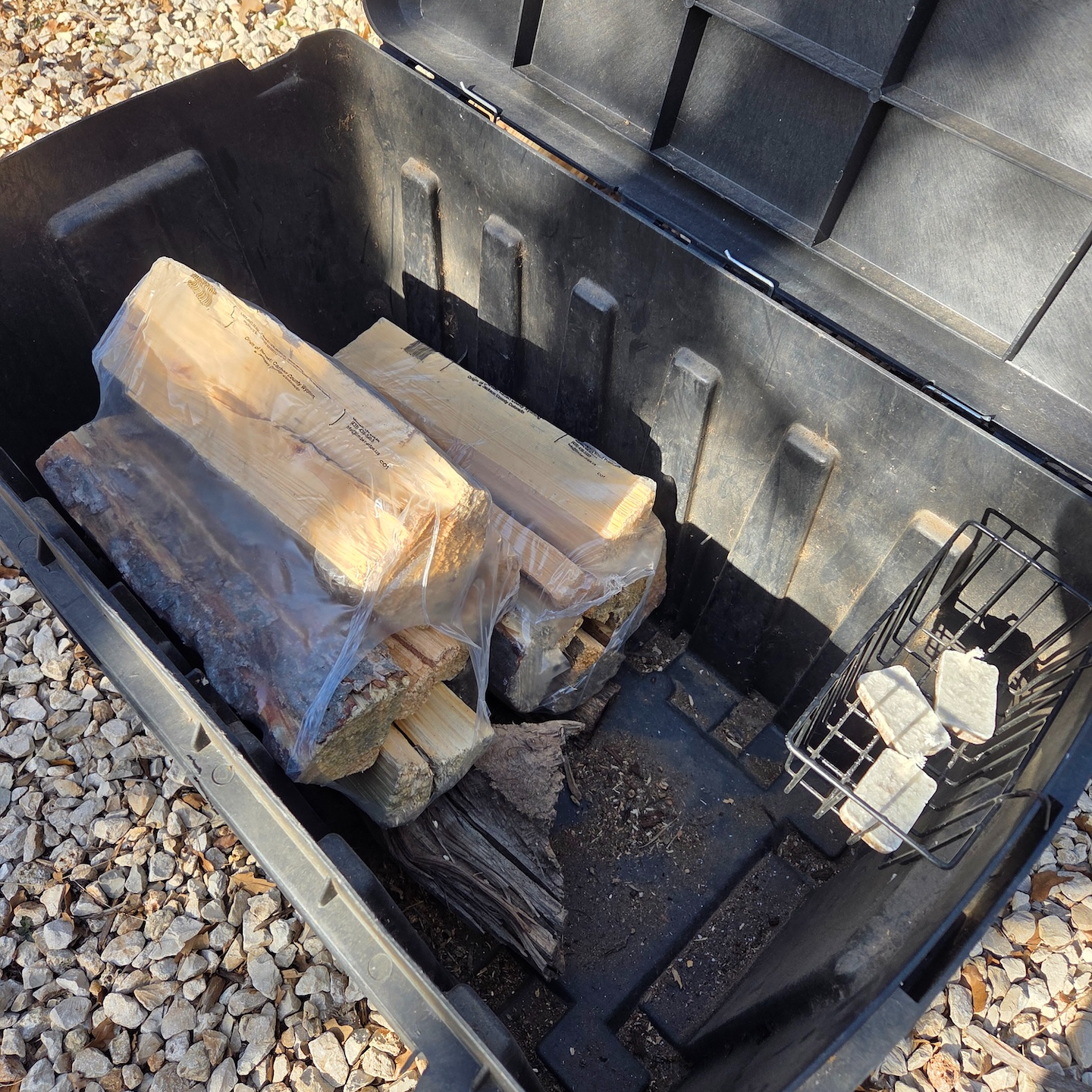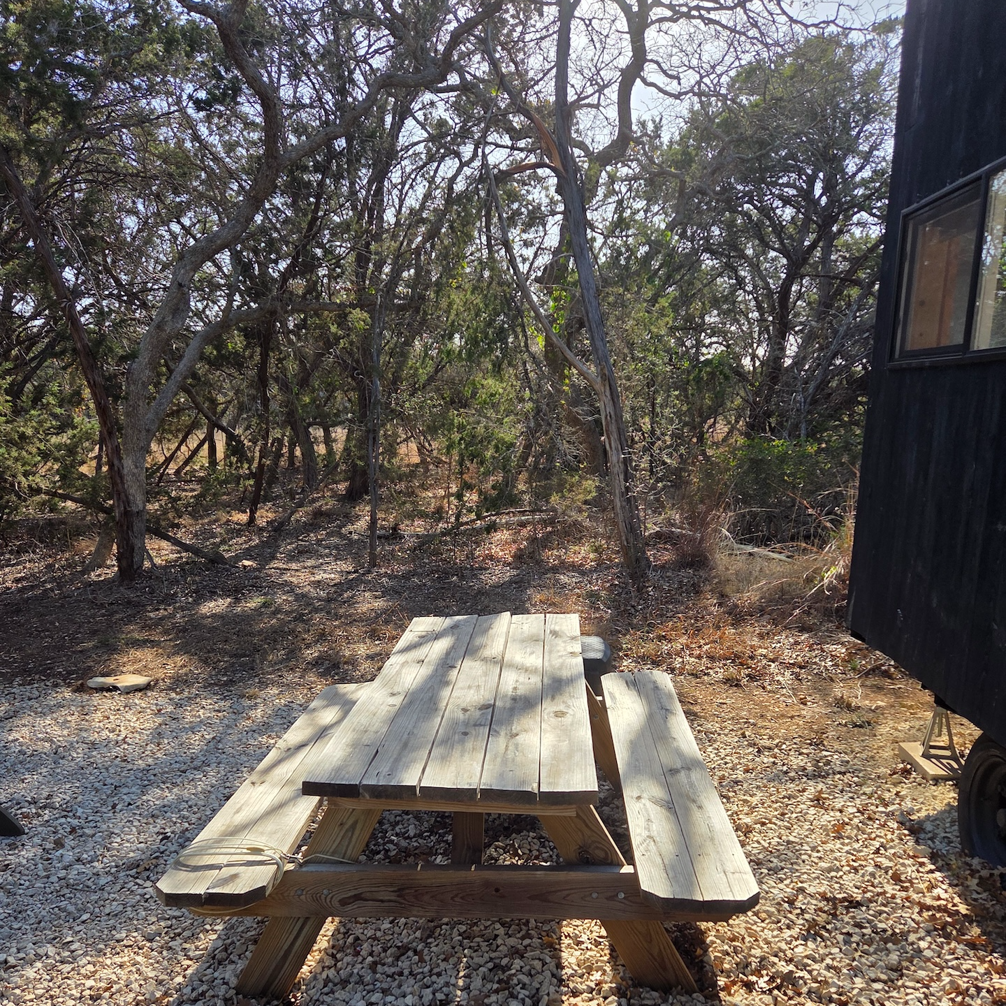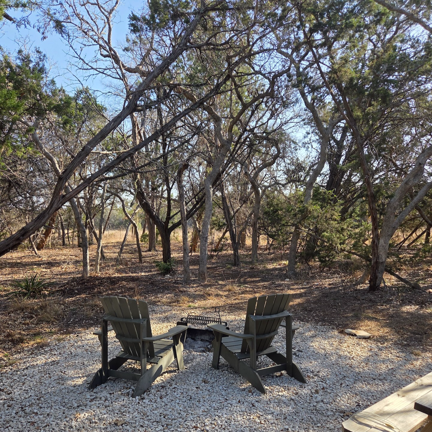 포스트카드 캐빈 힐 컨트리의 각 캐빈은 캐빈 앞에 차량을 주차할 수 있는 공간이 있고, 캐빈 옆쪽으로는 바깥 방향을 바라볼 수 있도록 불을 피울 수 있는 화구와 릴랙스 의자가 마련되어 있는 구조입니다. 캐빈의 위치와 계절에 따라 일부 캐빈에서는 외부 휴식 공간이 보이기도 하지만 크게 거슬리는 정도는 아니었습니다. 캐빈 앞으로는 식사를 할 수 있는 외부 식탁과 의자가 설치되어 있었고, 그 옆에는 캠프파이어 킷이 담겨 있는 커다란 통이 있었습니다. 참고로 캠프파이어 킷은 일일 $40의 Destination Fee에 포함되어 있어 매일 보충받을 수 있습니다. 그 옆으로는 화구와 의자가 함께 배치되어 있었습니다. 이번에 이용한 Nash 캐빈의 경우 나뭇잎이 무성하지 않은 겨울이었음에도 생각보다 프라이버시가 좋아 출입구나 나무 사이로 다른 캐빈들이 보이지는 않았습니다.