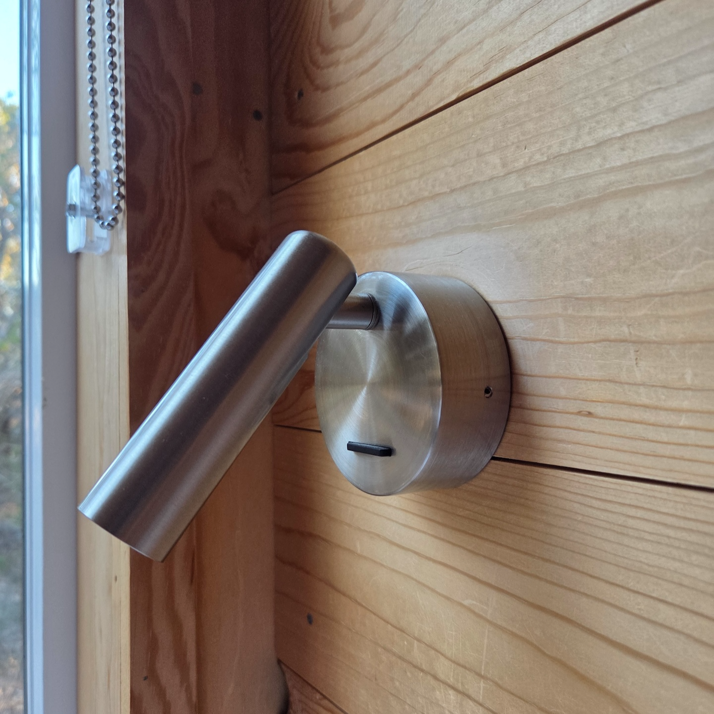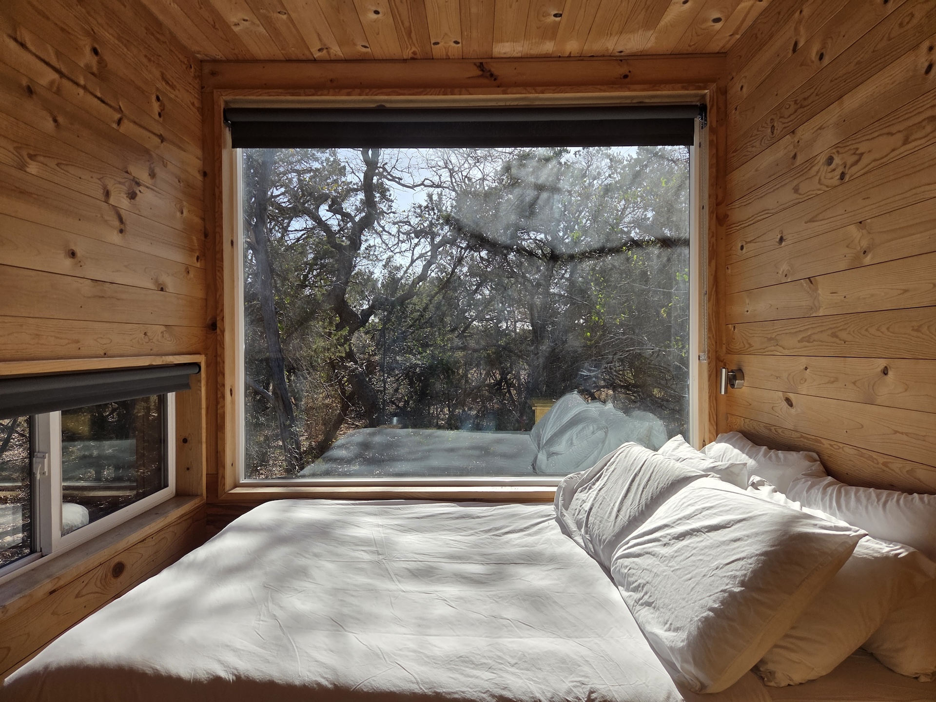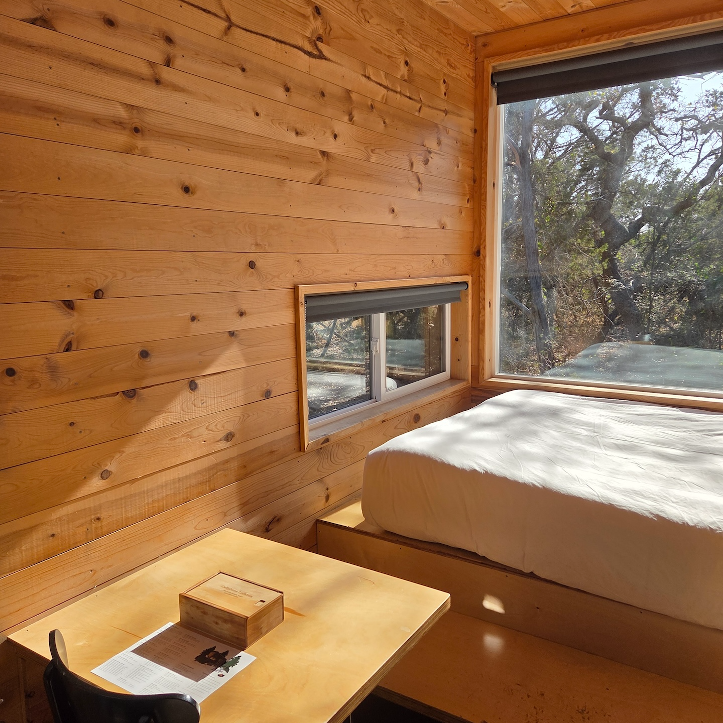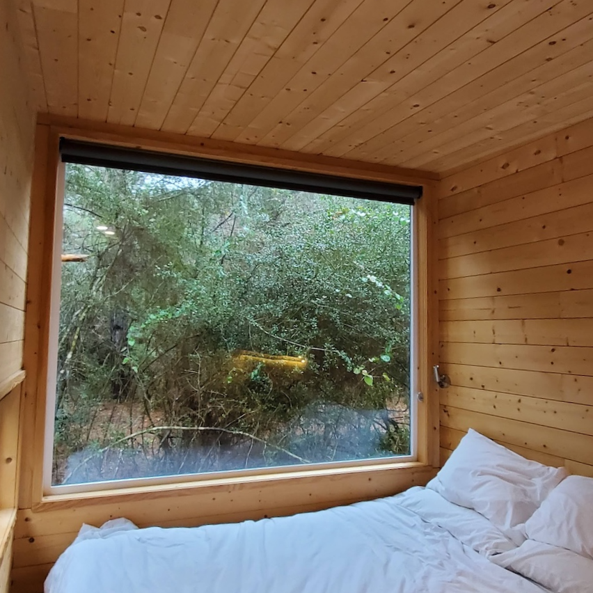 캐빈에 들어서면 가장 먼저 한쪽 벽면을 가득 채운 큰 창문과 그 앞의 침대가 눈에 들어옵니다. 침대는 프레임 없이 커스텀으로 제작된 단 위에 매트리스만 올려진 구조였고, 린넨과 베개 모두 바삭하고 좋은 상태였습니다. 매트리스는 약간의 사용감이 느껴지긴 했지만 크게 거슬리는 수준은 아니었습니다. 침대 머리맡에는 양쪽에 독서등이 하나씩 있었고, 큰 창문에는 전체를 가릴 수 있는 블라인드가 설치되어 있어 프라이버시 확보나 햇빛 차단이 가능했습니다. 매트리스 발치 쪽에는 약간의 여유 공간이 있어 개인 물품을 보관할 수 있었고, 그 위쪽에는 미닫이 창이 설치되어 있었습니다. 이 창은 캐빈 외부의 식탁과 화구를 향해 있어 밖에 있는 사람과 간단한 소통도 가능했습니다.