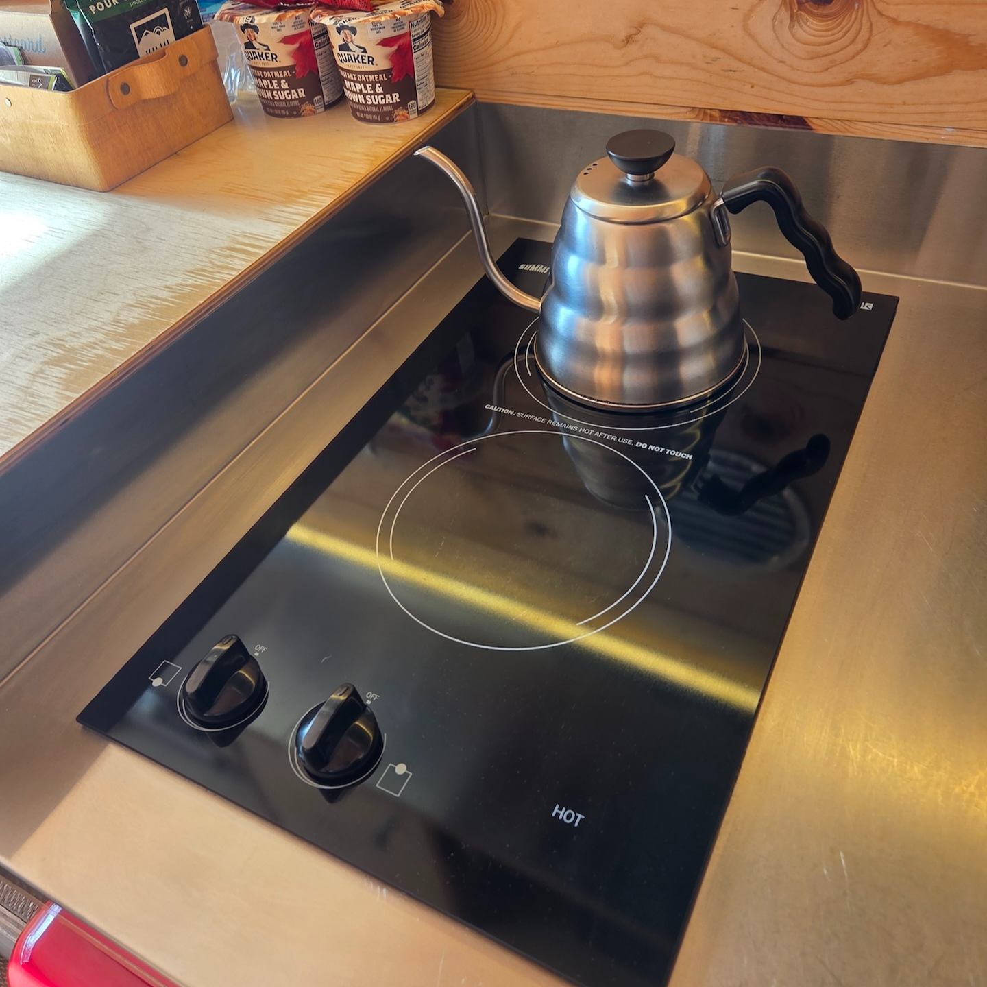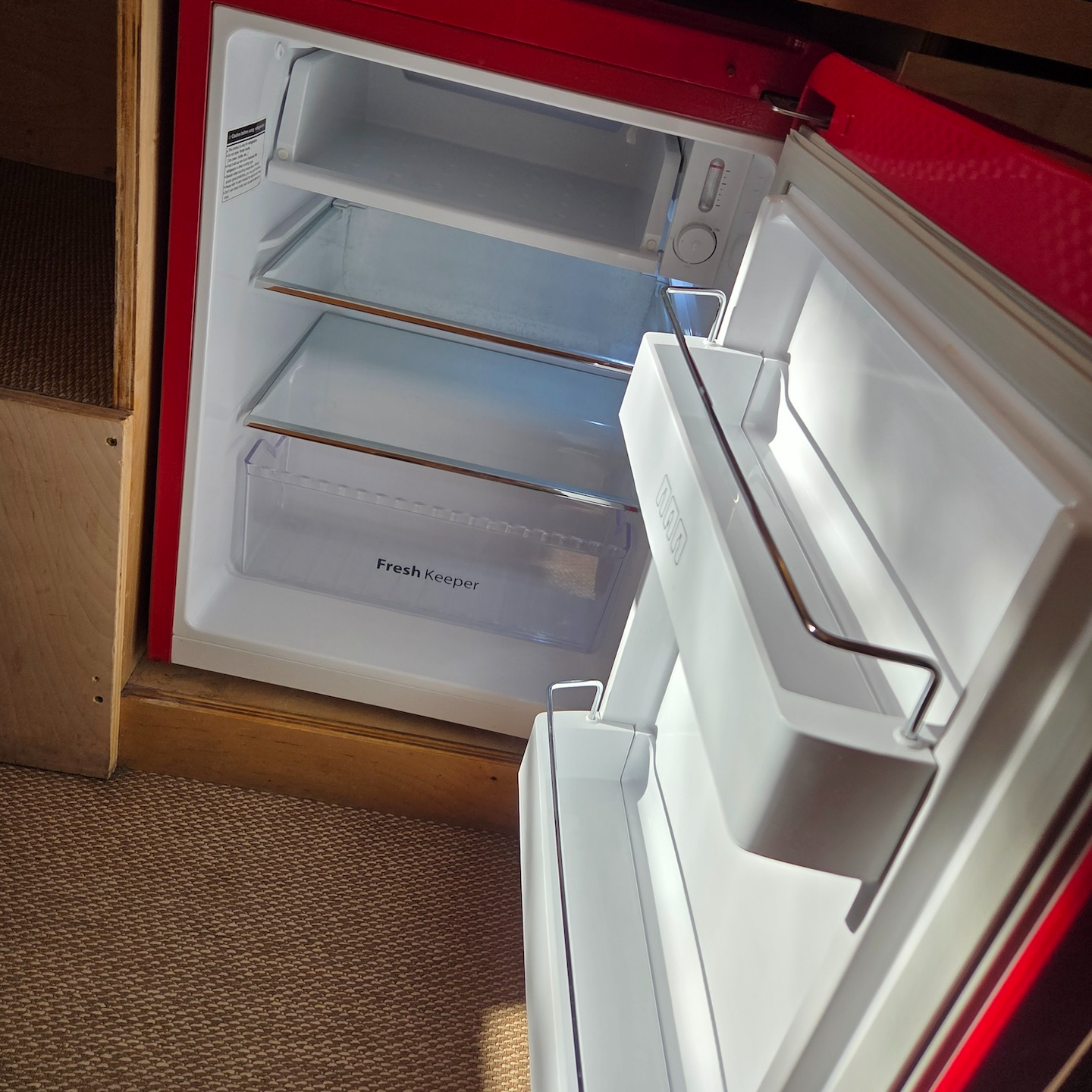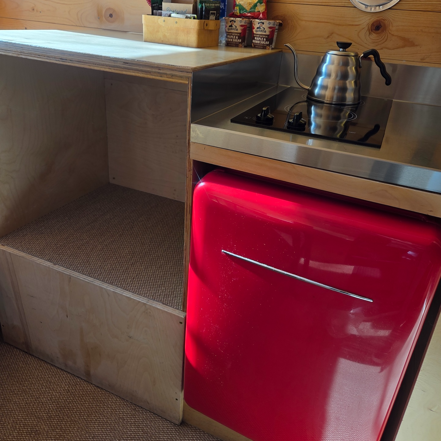 침대 옆에는 작은 간이 주방이 있습니다. 주방 가장 왼쪽에는 넉넉한 수납공간이 있어 실온 보관이 가능한 식료품 등을 보관할 수 있고, 그 옆으로 화구, 냉장고, 싱크대가 순서대로 배치되어 있습니다. 냉장고는 강렬한 빨간색 디자인으로, 공간이 아주 넓지는 않지만 별도의 냉동칸이 없는 점을 제외하면 사용에 큰 불편은 없었습니다. 냉장고 위에는 2구 하이라이트 전기레인지가 설치되어 있는데, 인덕션이 아닌 방식이라 사용 후 표면이 뜨겁기 때문에 주의가 필요합니다. 그 옆에는 간단한 조리가 가능한 작업 공간이 있고, 이어서 싱크대가 위치해 있습니다. 싱크대 수압은 아주 강한 편은 아니었지만 사용에는 문제가 없었고, 온수는 캐빈 내 소형 히트탱크로 공급되는 방식이라 싱크대에서 온수를 많이 사용할 경우 샤워 시 온수가 부족해질 수 있다는 안내가 있었습니다. 싱크대 아래에는 쓰레기통과 청소도구가 보관되어 있었습니다.