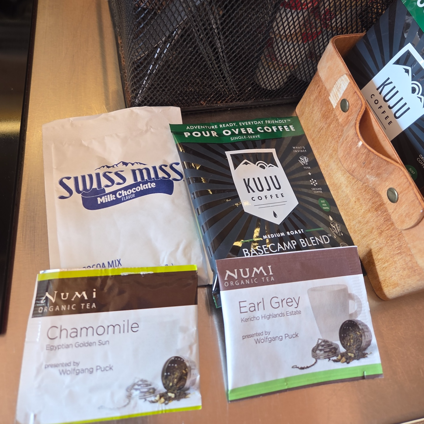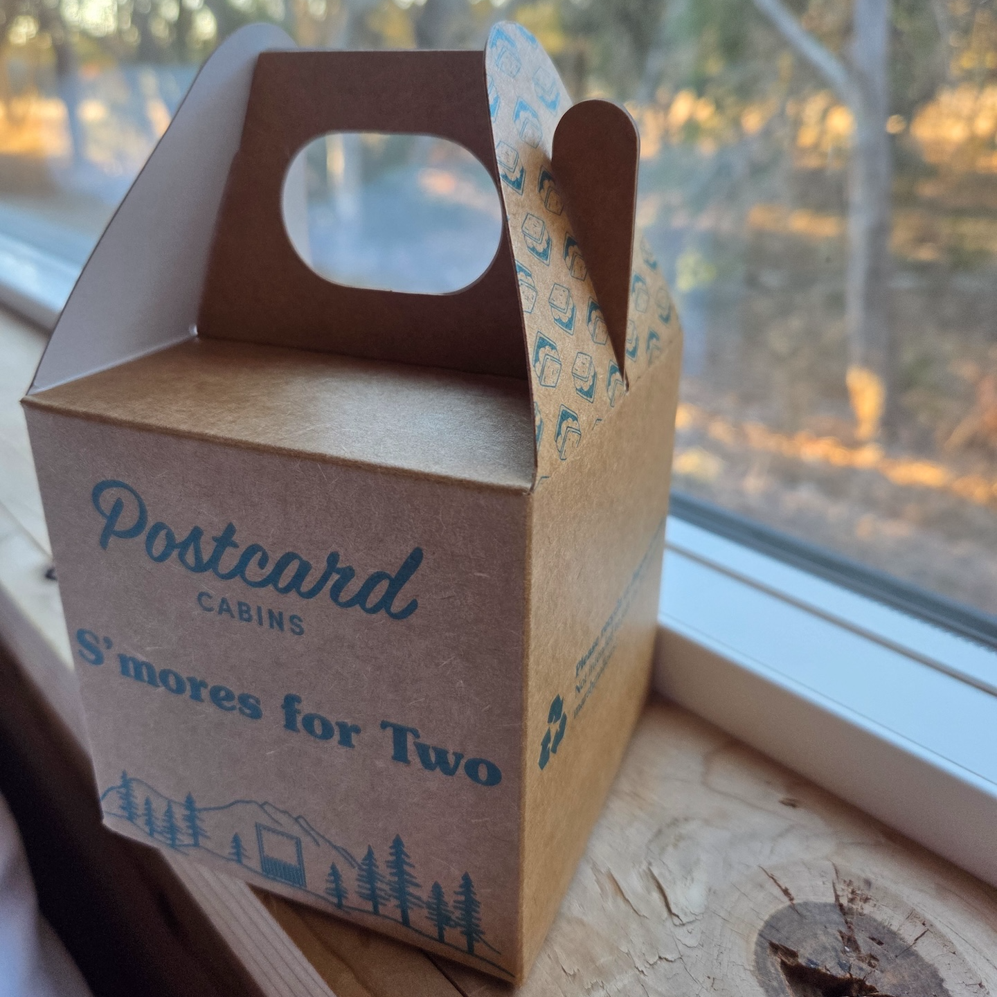 먹고 마실 수 있는 것들로는 약 1리터의 생수 2병이 준비되어 있었습니다. 다만 포스트카드 캐빈 힐 컨트리에서 머무르며 요리를 하고 커피를 마시기에는 이 양이 부족하기 때문에 여분의 생수를 미리 준비해 오시는 것을 추천드립니다. 핸드드립용 커피백과 캐모마일, 얼그레이 티, 스위스 미스 핫초코가 준비되어 있었고, 커피용 크림과 설탕도 넉넉하게 비치되어 있었습니다. 이 외에도 간단히 먹을 수 있는 치즈잇 스낵과 아침 대용으로 가능한 인스턴트 오트밀도 준비되어 있었고, 캠프파이어를 즐기는 투숙객을 위해 스모어 세트도 제공되었습니다. 마시멜로, 초콜릿, 달달한 시나몬 크래커가 각각 2개씩 들어 있었는데 꽤 달지만 맛있었습니다. 참고로 이러한 식음 어매니티는 하루 $40의 Destination Fee에 포함되어 있어 2박 이상 숙박 시 매일 리필받을 수 있습니다