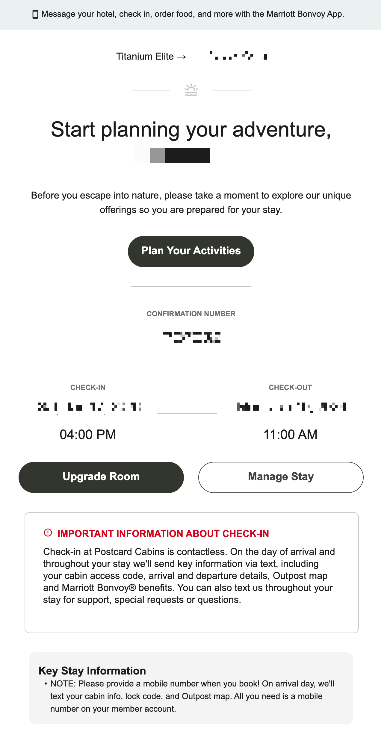 저는 포스트카드 캐빈 힐 컨트리에 숙박할 당시 메리어트 본보이 프로그램에 티타늄 회원이었습니다. 메리어트 본보이 티타늄 엘리트 회원은 메리어트 계열 호텔에 투숙할 때 기본적으로 객실 업그레이드(스위트 포함, 가능 시), 라운지 이용, 조식 제공, 오후 4시 레이트 체크아웃 등의 플래티넘 엘리트 혜택에 더해 포인트 적립률이 75% 보너스로 증가하며, 일부 브랜드에서 우선적인 업그레이드 우선순위를 받는 등 약간 더 많은 혜택을 제공받습니다. 단, 포스트카드 캐빈 힐 컨트리는 아웃도어에 위치한 캐빈이라는 호텔 특성상 받을 수 있는 혜택에 제한이 있었습니다. 제가 메리어트 본보이 티타늄 엘리트 회원으로 포스트카드 캐빈 힐 컨트리에 숙박하면서 받은 혜택으로는 기존 체크아웃 시간보다 1시간 연장된 12시 레이트 체크아웃과 숙박요금에 대한 75% 추가 포인트, 웰컴 기프트 혜택이 있었습니다. 웰컴 기프트의 경우 메리어트 본보이 1000 포인트와 F&B 어매니티(트레일 믹스, 그레놀라 바, 프레텔 등의 스낵바구니) 중에서 고를 수 있었습니다.