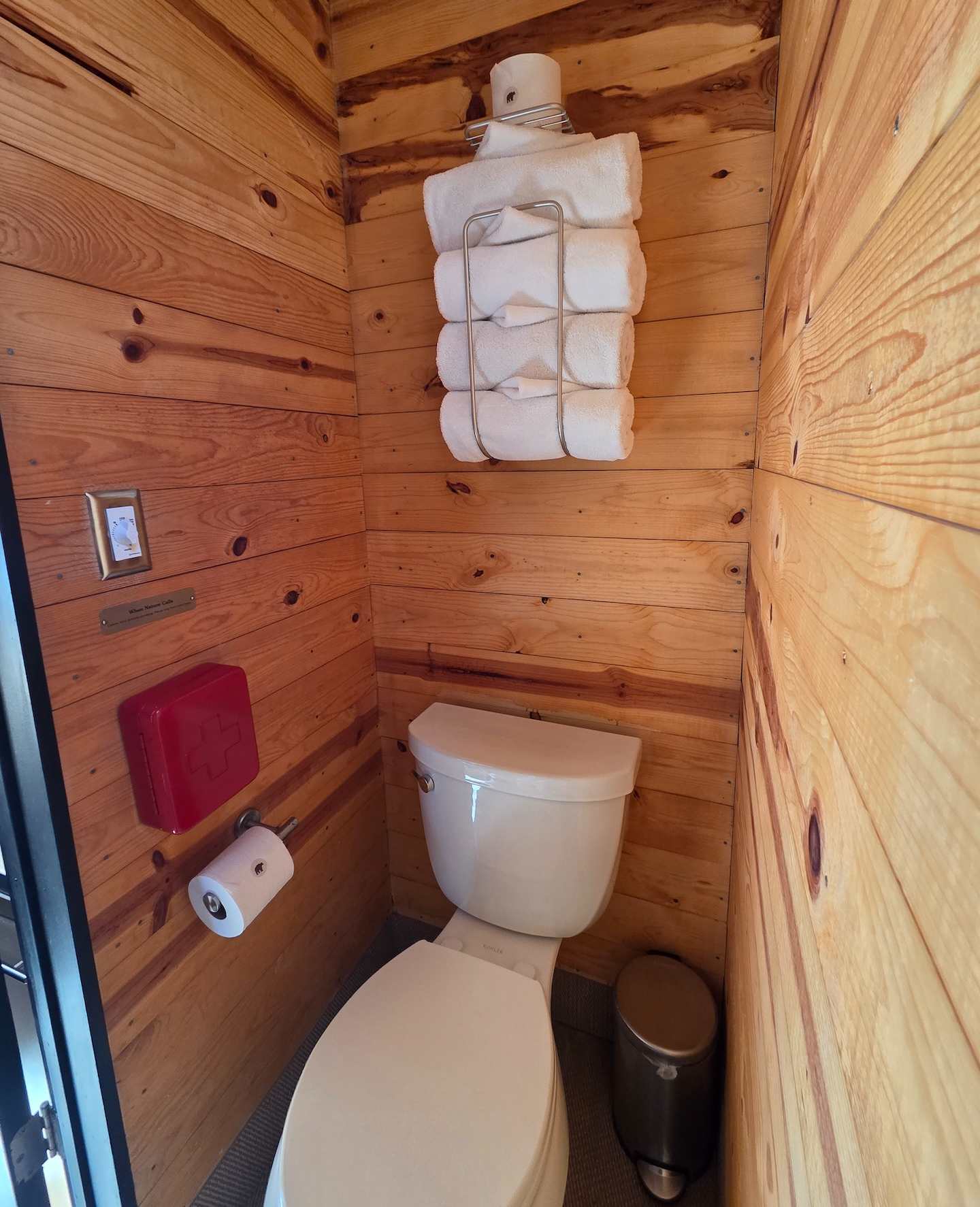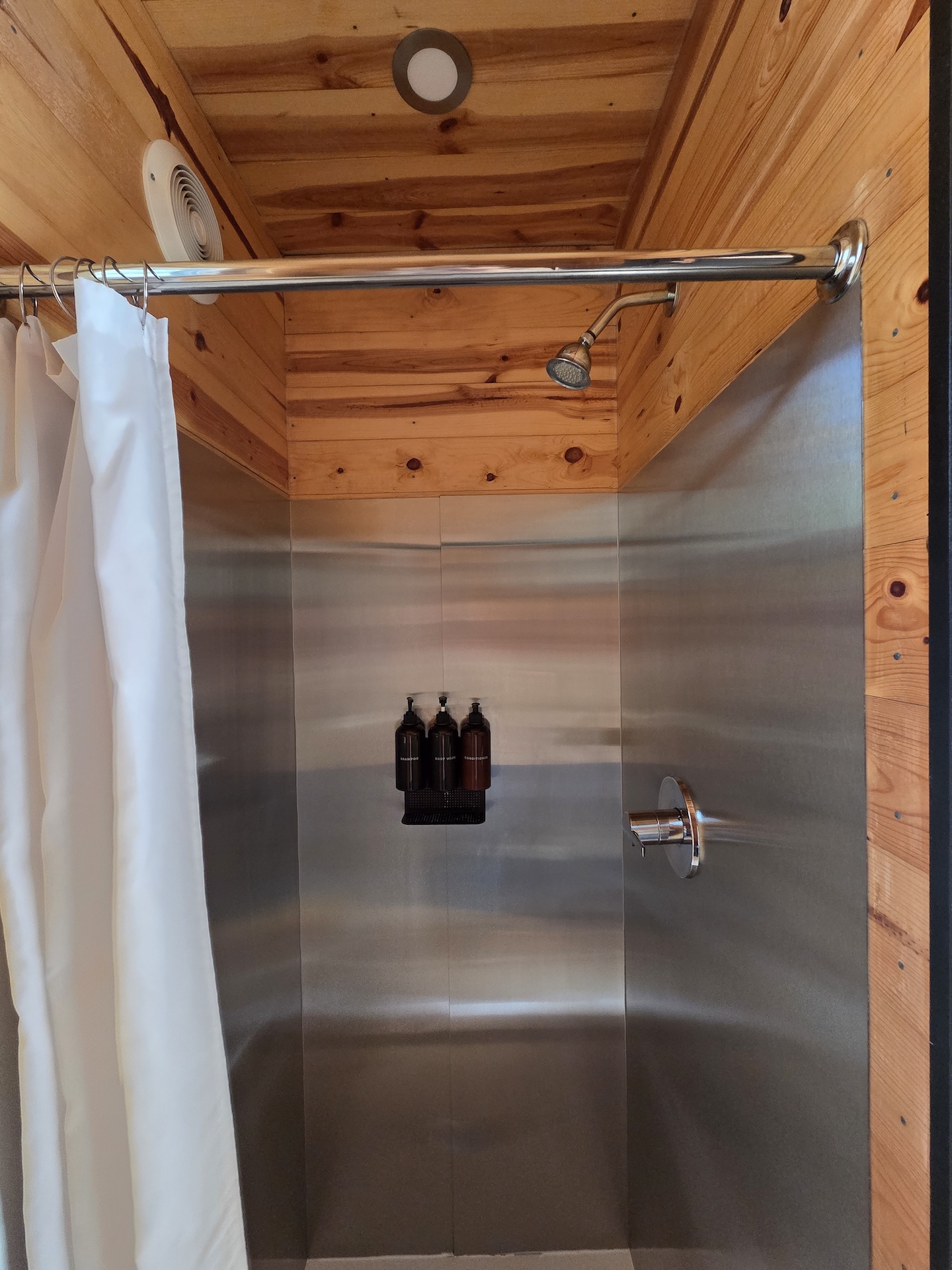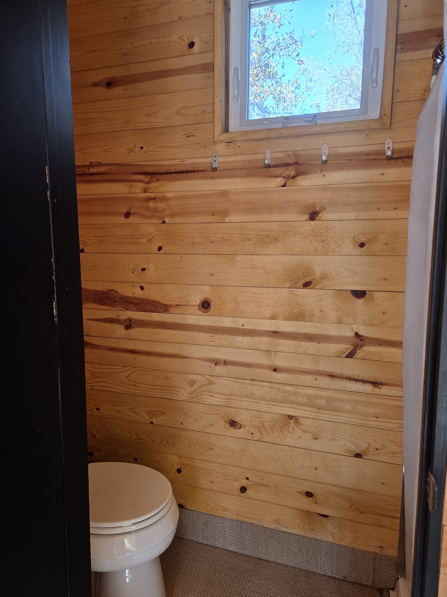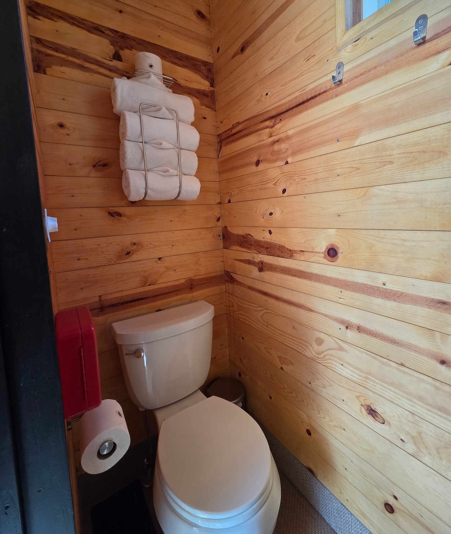 캐빈 입구 기준 오른쪽에는 화장실이 위치해 있습니다. 왼쪽에는 변기가, 오른쪽에는 샤워부스가 설치되어 있습니다. 캐빈 내부 벽은 나무로 마감되어 있었지만 샤워부스 내부는 스테인리스 스틸로 마감되어 있었고, 천장까지 완전히 밀폐된 구조는 아니었습니다. 또한 샤워부스 하단 단차가 낮고 커튼 길이가 충분히 길지 않아 샤워 시 물이 밖으로 튈 가능성이 있는 구조였습니다. 다만 온수 사용량이 제한적이다 보니 자연스럽게 물 사용을 줄이게 되어 실제로 크게 불편함을 느끼지는 않았습니다.