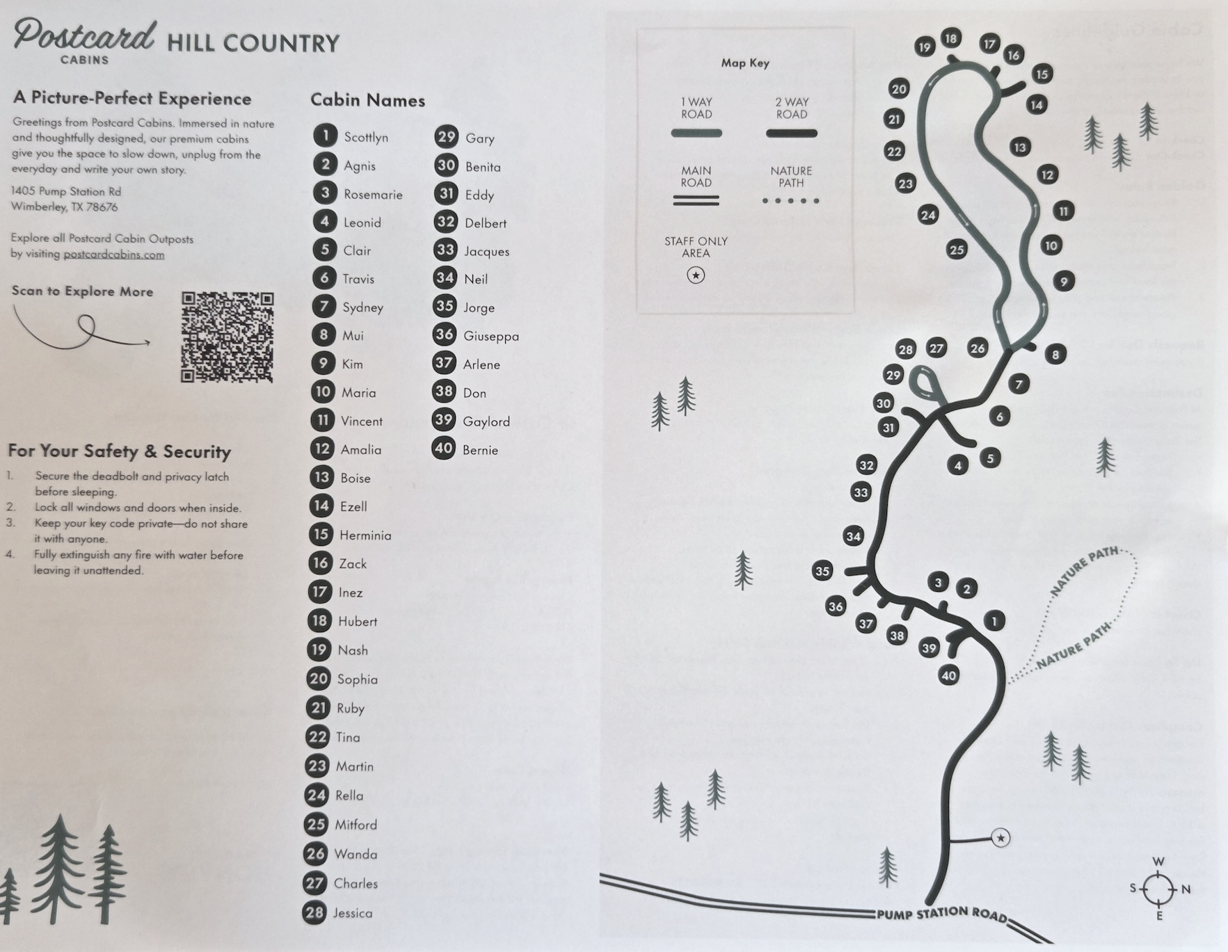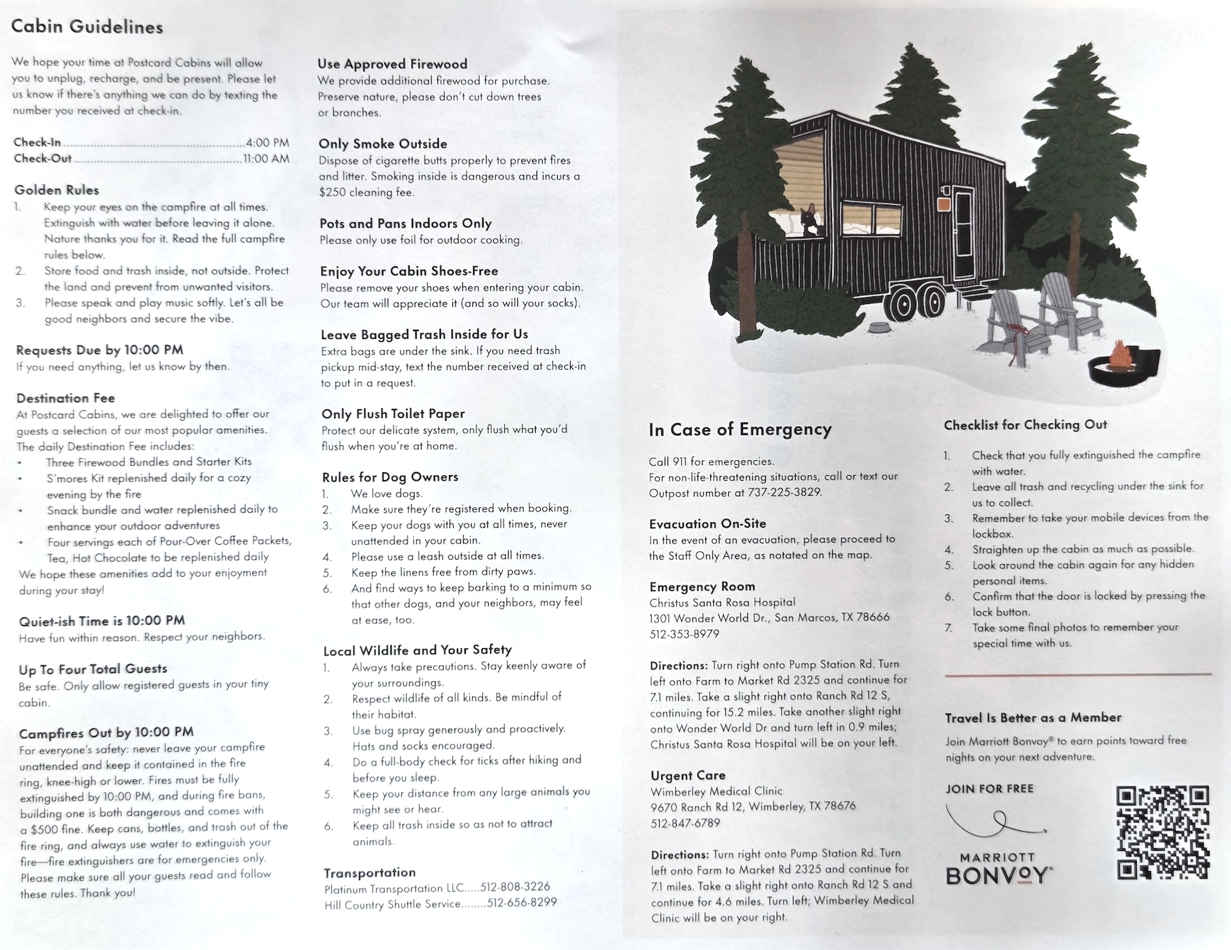 포스트카드 캐빈 힐 컨트리에서는 스태프를 직접 마주칠 일이 많지 않습니다. 아마도 복잡하지 않은 자연 속에서의 경험이라는 콘셉트에 따른 운영 방식이 아닐까 싶습니다. 실제로 투숙하는 동안 스태프를 마주친 경우는 숙박 둘째 날 필요한 물품을 리필받을 때를 제외하면 거의 없었습니다. 대부분의 커뮤니케이션은 문자 메시지를 통해 이루어졌고, 스태프들은 항상 빠르고 친절하게 응답해 주었습니다. 참고로 스태프들은 포스트카드 캐빈 힐 컨트리 내에 상주하고는 있지만, 비응급 상황에서는 직접 찾아가는 방식이 아니라 문자 메시지나 전화를 통해 연락하도록 안내되어 있습니다. 또한 응급 상황의 경우에는 스태프가 아닌 911로 바로 연락하도록 되어 있는 점도 참고하시면 좋을 것 같습니다.