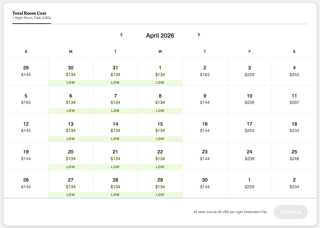룸 타입별 가격 차이는 크지 않습니다. 비수기 평일 기준으로 1 퀸 스탠다드와 Accessible 캐빈은 세금 포함 약 155달러 정도이고, 2 퀸 벙커베드 스탠다드는 약 160달러 정도입니다. 주말이나 공휴일의 경우 가격이 더 올라 세금 포함 최저가가 약 300달러 초반대에 형성되기도 합니다. 포스트카드 캐빈 힐 컨트리의 포인트 숙박 가격은 상대적으로 경쟁력이 없었습니다. 유상 숙박 가격이 155달러인 날 기준으로 포인트 숙박은 약 38,000포인트 정도였고, 포인트 숙박의 경우 Destination Fee 명목으로 1박당 40달러가 추가되어 1포인트당 약 30센트(약 450원)의 가치로 사용하게 되기 때문에 대부분의 경우 가성비가 좋지 않습니다.