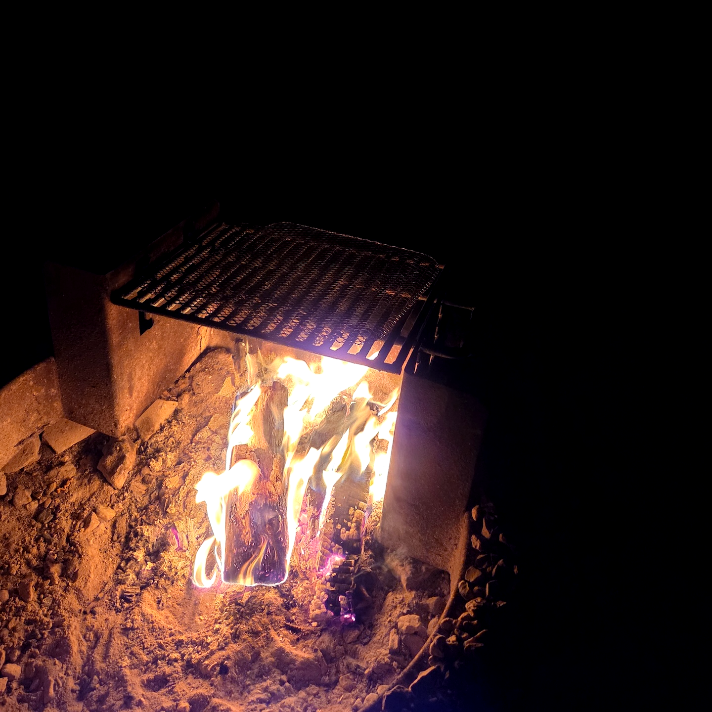 외부 어매니티로는 캠프파이어 킷이 제공됩니다. 캠프파이어 통 안에는 세 묶음의 장작과 발화제가 들어 있었고, 캔들 라이터는 주방의 칼이 보관된 곳에 함께 비치되어 있었습니다. 또한 식탁과 의자가 일체형으로 구성된 야외 테이블 세트와 파이어 핏 주변에는 2개의 릴랙스 체어가 배치되어 있었습니다. 최대 정원이 4명인 캐빈의 경우 릴랙스 체어가 4개까지 제공되는 것도 확인할 수 있었습니다. 파이어 핏에는 화로와 함께 바비큐 그릴도 설치되어 있었는데, 제가 이용한 내쉬 캐빈의 경우 그릴이 약간 기울어져 있었지만 높이 조절이 가능해 사용하는 데 큰 문제는 없었습니다.