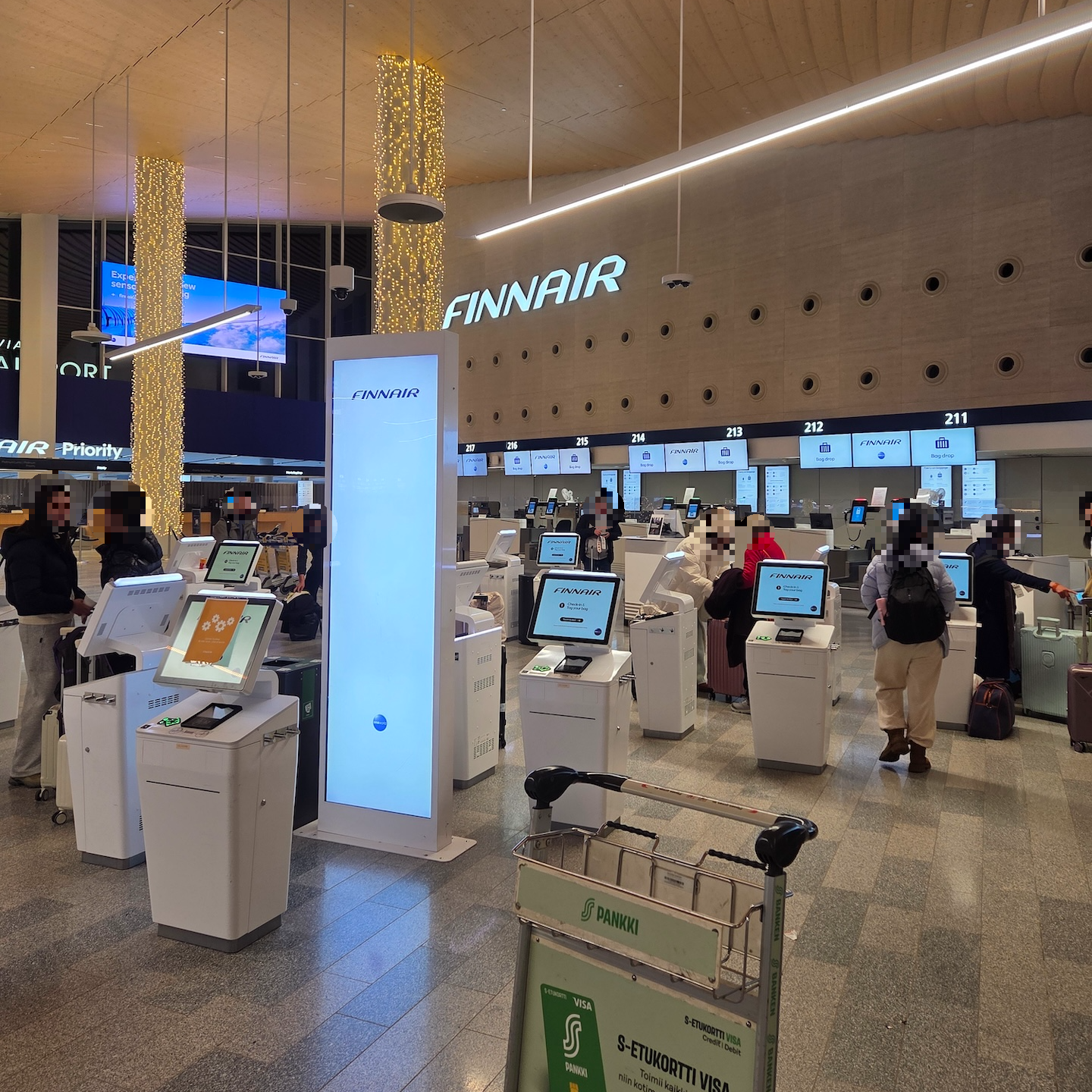 헬싱키 반타 공항의 체크인 카운터는 보안 검색대를 바라본 방향 기준으로 오른쪽에 100번대와 200번대, 왼쪽에 300번대와 400번대가 위치해 있습니다. 핀에어의 체크인은 200번대 카운터에서 이루어집니다. 헬싱키 공항에서 핀에어의 체크인은 기본적으로 셀프 체크인과 백드롭으로 이루어져 있습니다. 헬싱키 반타 공항을 허브로 쓰는 핀에어 답게 수많은 체크인 키오스크가 위치해 있고요, 직원들도 많아서 어렵지 않게 체크인을 할 수 있습니다. 체크인 후에는 201 ~ 210번의 백 드롭 카운터로 가서 짐을 부치면 되고요, 만약 공항 직원에게 체크인을 직접 받아야 하는 상황이라면 211 ~ 217번 카운터로 가시면 도움을 받을 수 있습니다.