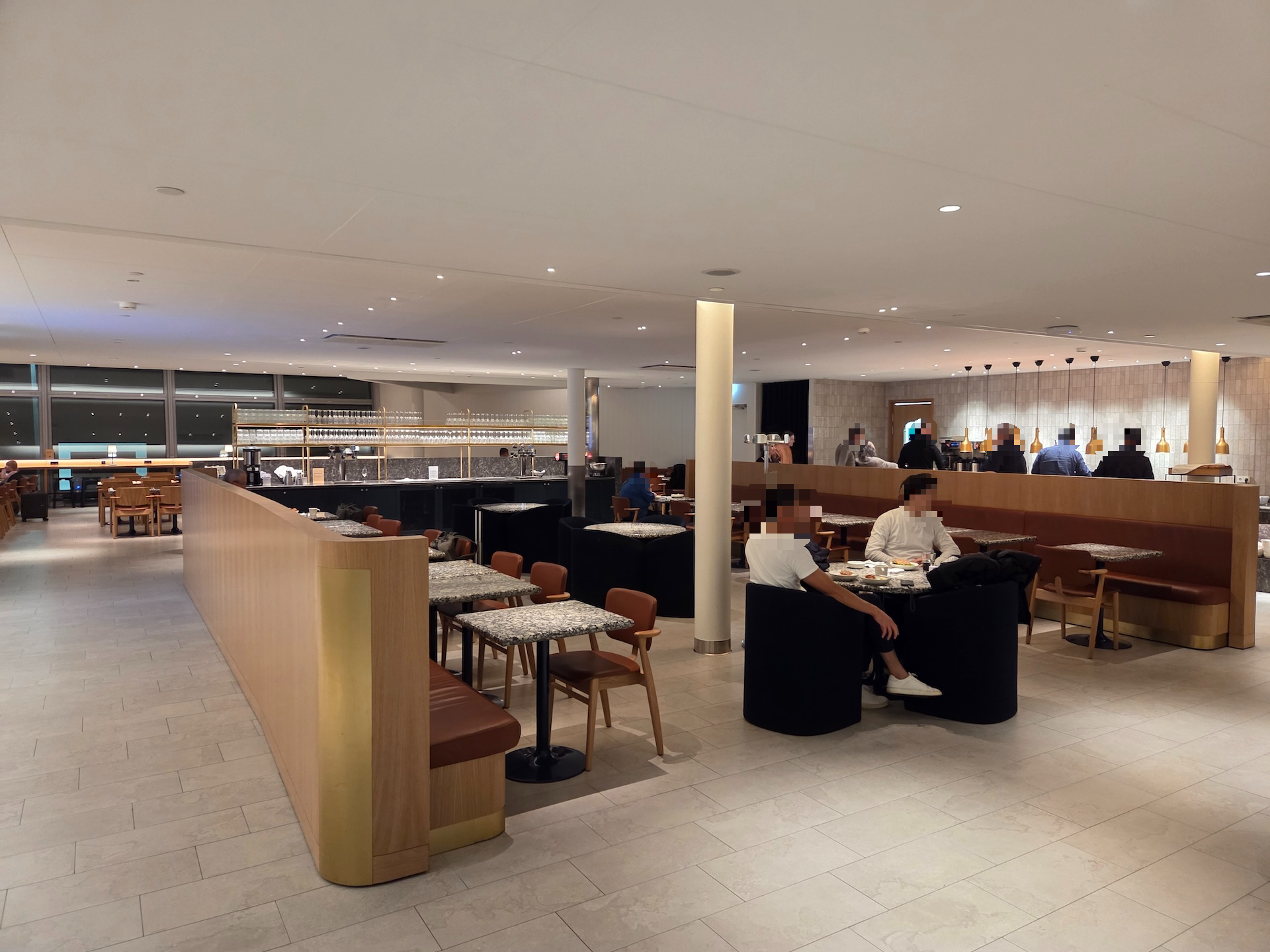 이 공간을 지나 왼쪽의 조금 더 깊숙이 들어가면 프라이버시가 보장되는 높은 칸막이들을 가진 의자들이 있고 공항 내부를 바라보는 창가에는 마찬가지로 바 테이블과 스툴이 일자로 배치되어 있습니다.
