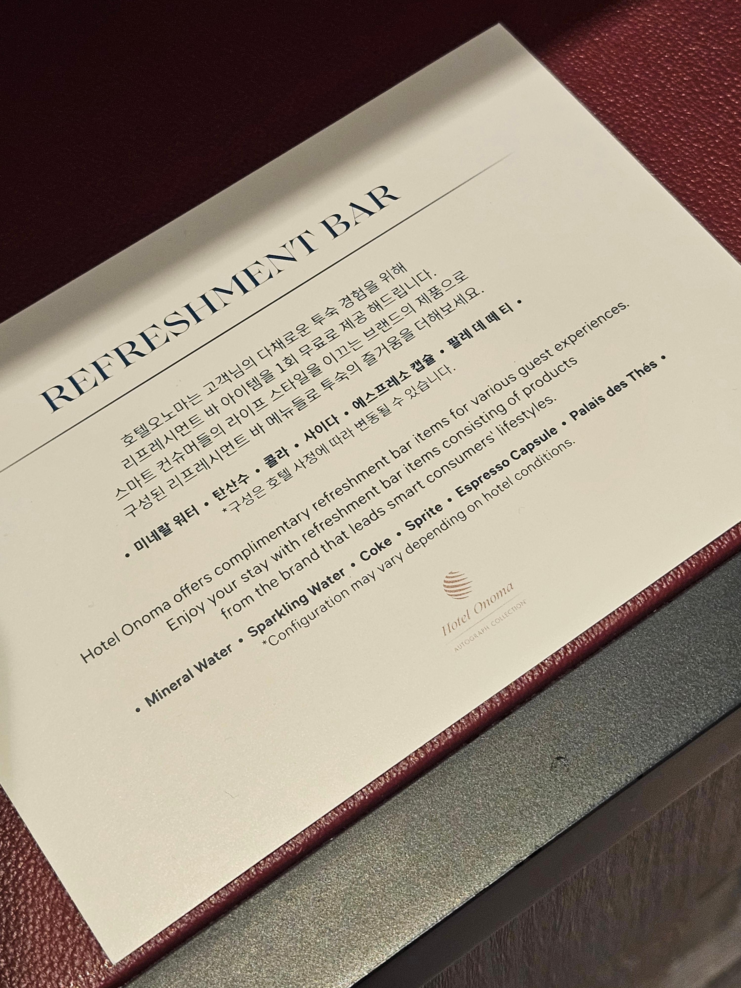 호텔 오노마의 기본 어매니티는 충실한 편입니다. 네스프레소 머신과 더불어 네스프레소 캡슐이 하루 4개씩 제공되고요, 티백도 제공됩니다. 투숙 중 미니바가 한 번 무료로 제공되는데, 미니바에는 기본적으로 펩시 콜라 2캔, 스프라이트 2캔, 빅토리아 탄산수 2병, 생수 2병이 있고, 생수는 매일 2병씩 제공이 됩니다.