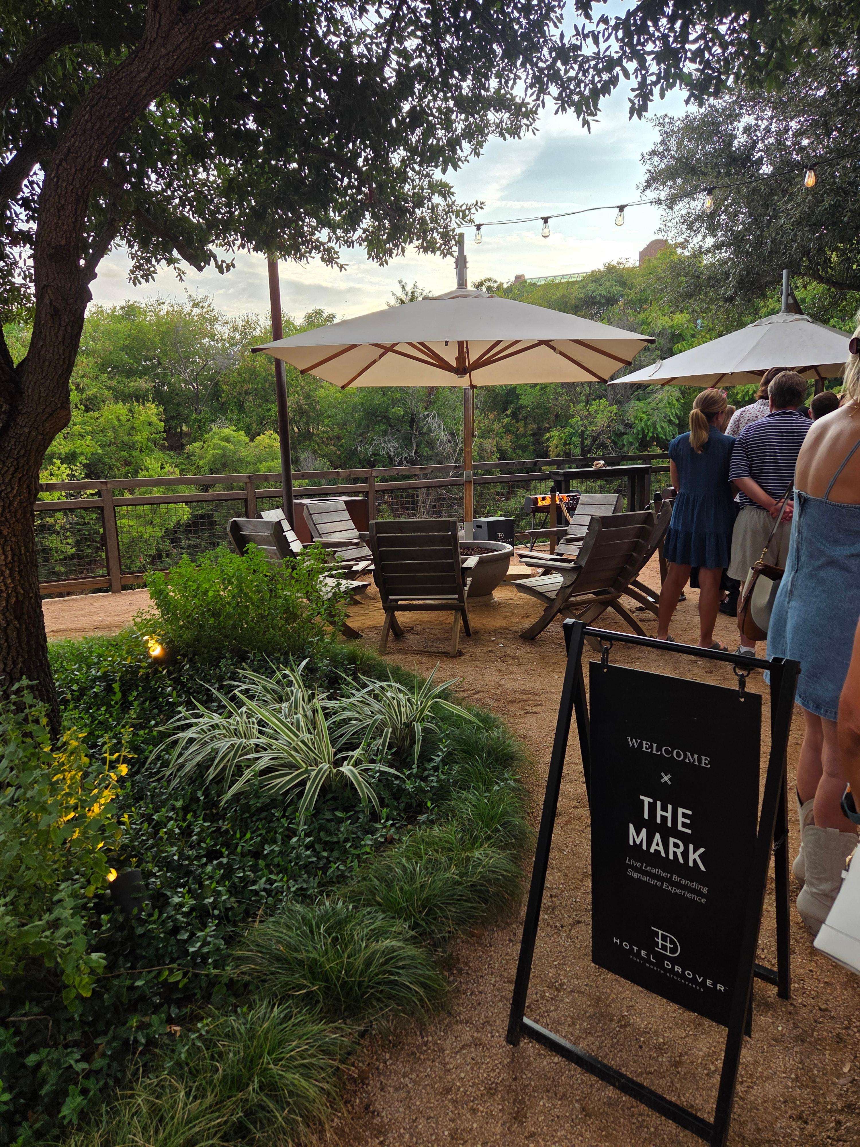 모든 투숙객들에게 다 제공되는지는 모르겠습니다만, 체크인을 할 때 가죽 러기지 태그를 바꿀 수 있는 교환권을 하나 받았습니다. The Mark라 불리는 이 가죽 러기지 태그 체험은 오후 7시부터 오후 8시까지 호텔의 뒷 정원에서 진행되었습니다. 간단하게 말해서 호텔에서 자체 제작한 약간은 투박하기도 하고 와일드하기도 한 가죽 태그에 원하는 숫자나 이니셜을 불에 달군 쇠로 찍어내는 낙인 체험이라고 보시면 됩니다. 물론, 불에 달궈진 쇠를 이용하기에 직접 찍는 건 아니고 원하는 이니셜을 말하면 직원분께서 디자인을 몇 가지 추천해 주시고 낙인쇠로 태그에 낙인을 찍어주시는 방식입니다. 사실 별거 아닌 이벤트일 수도 있지만, 아무래도 ‘낙인’이라는 게 또 텍사스 문화의 대표적인 요소이기도 하다 보니 개인적으로는 맘에 들었습니다. 이 러기지 태그를 교환할 수 있는 쿠폰은 한 방에 한 장씩 제공되었지만, 원하는 경우 개당 25달러를 지불하고 더 받을 수도 있다고 합니다.