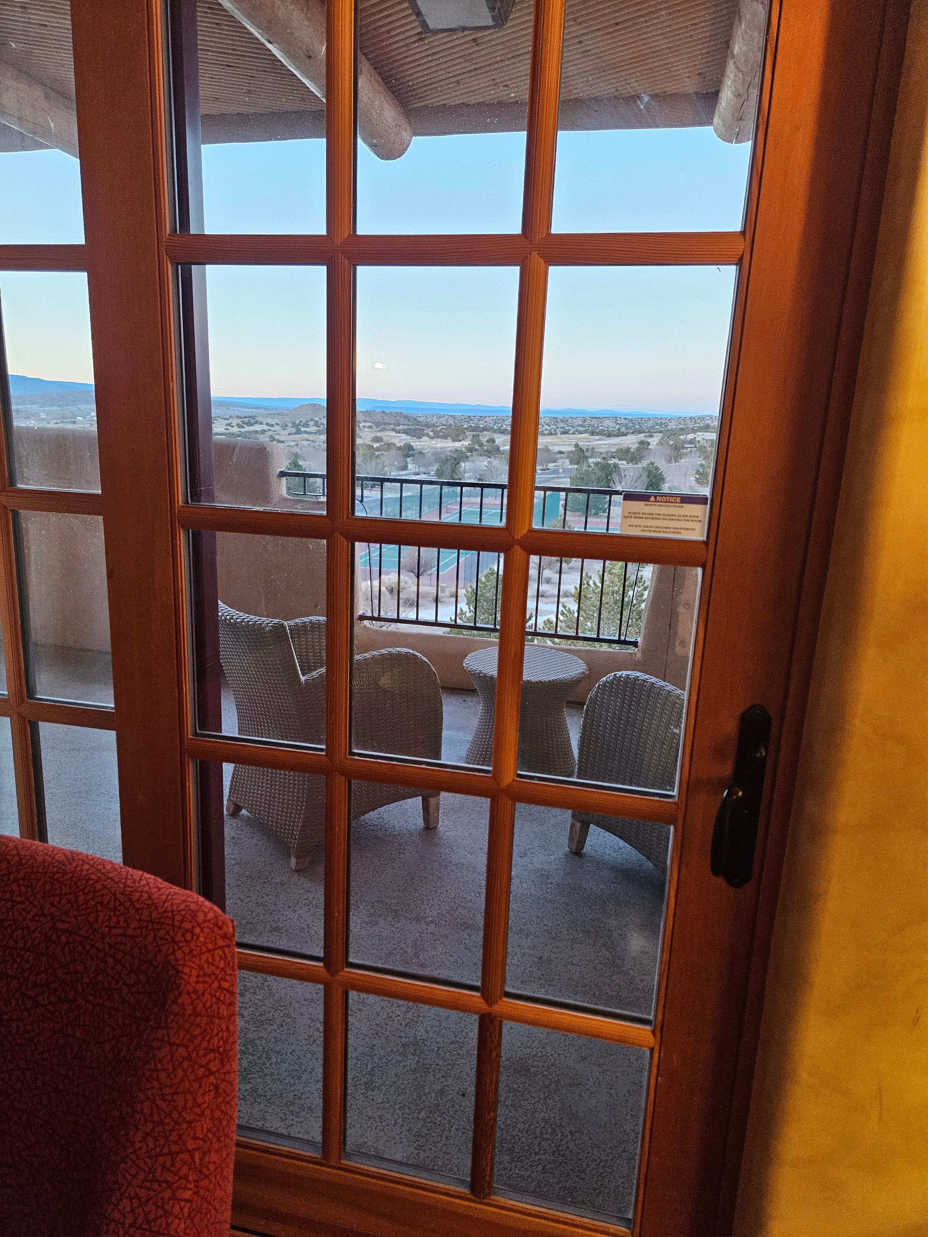 객실 한 면에는 발코니가 있었는데 이 발코니는 베드룸 부분까지 이어져있는 넓은 발코니였습니다. 발코니에도 의자와 사이드 테이블이 있었고요, 발코니에서는 뻥 뚫린 뉴멕시코의 탁 트인 풍경을 볼 수 있었습니다. 하지만 제가 방문했던 시기가 겨울이었기에, 발코니에서 뭔가를 하기에는 날씨가 많이 추웠습니다.